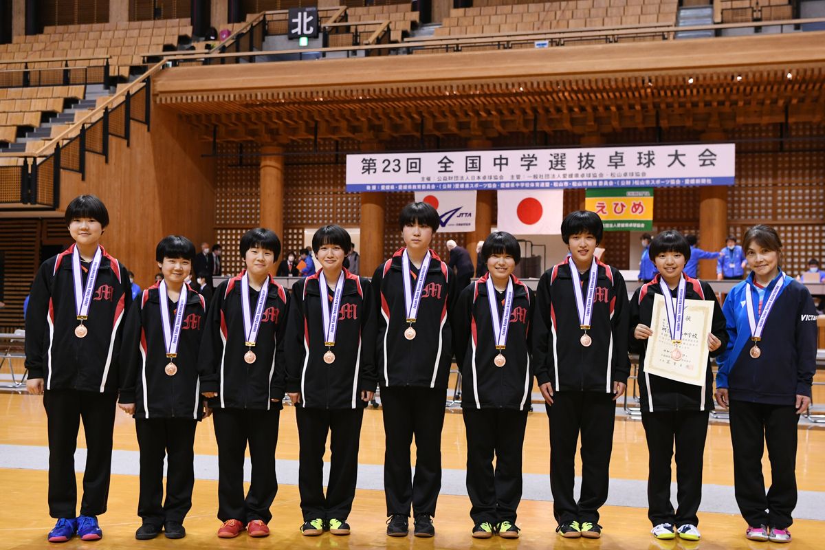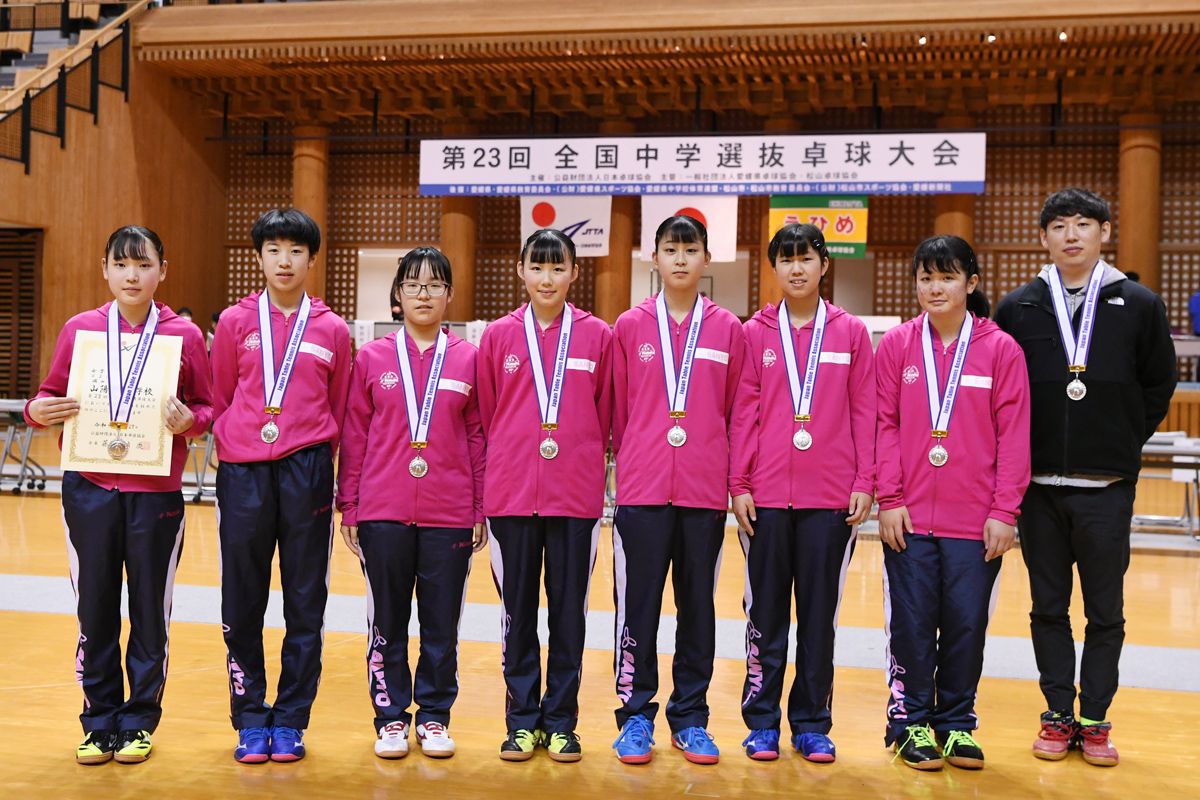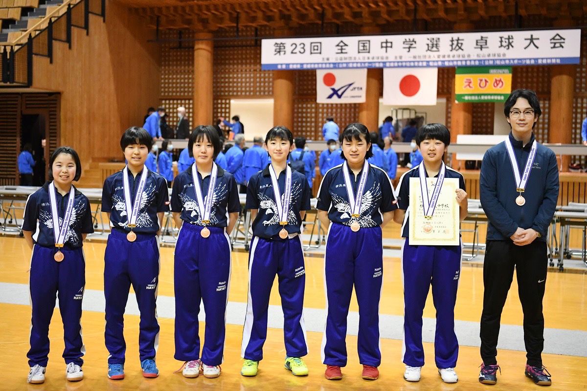 第23回全国中学選抜卓球大会が3月26~27日、愛媛県武道館(愛媛)で開催された。出場できるのは1・2年生のみ、1複4単の団体戦で1選手が重複して出場できないので6~8名のチーム構成で行う。そのため多くの学校に上位進出のチャンスがある大会だ。今年も全国から予選を勝ち抜いた男女各48校が日本一を争って熱戦を繰り広げた。