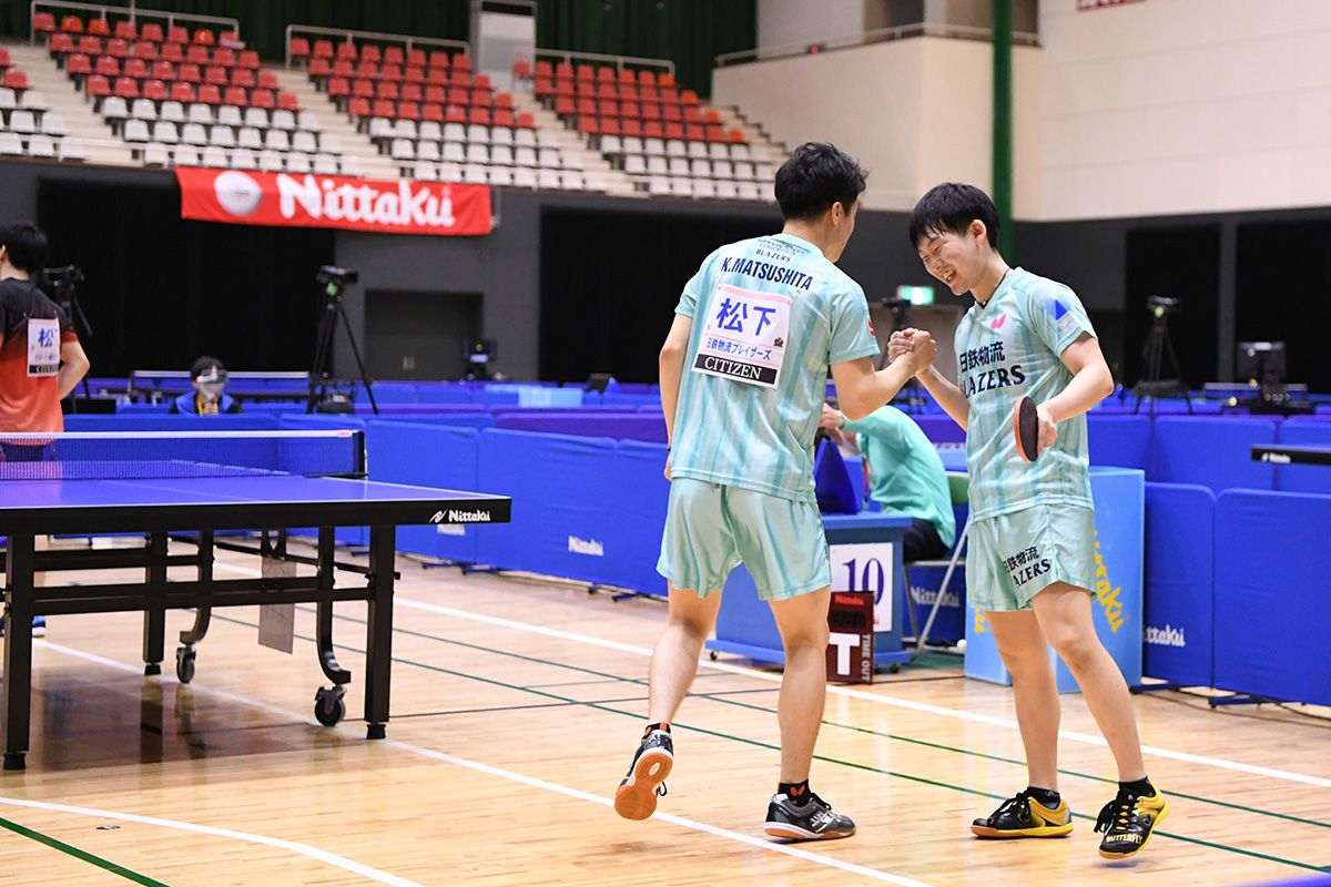 2位の松下大星/宮本は、決勝トーナメント1回戦で福田修也/馬渡元樹(信号器材)、2回戦で定松祐輔/高見真己(日鉄物流ブレイザーズ)をともにゲームオールで下し、決勝まで勝ち上がった。決勝では鋭い攻めで押し込む場面も見られたが、しぶとく返してくる日鉄物流ブレイザーズペアに惜しくも優勝を阻まれた。