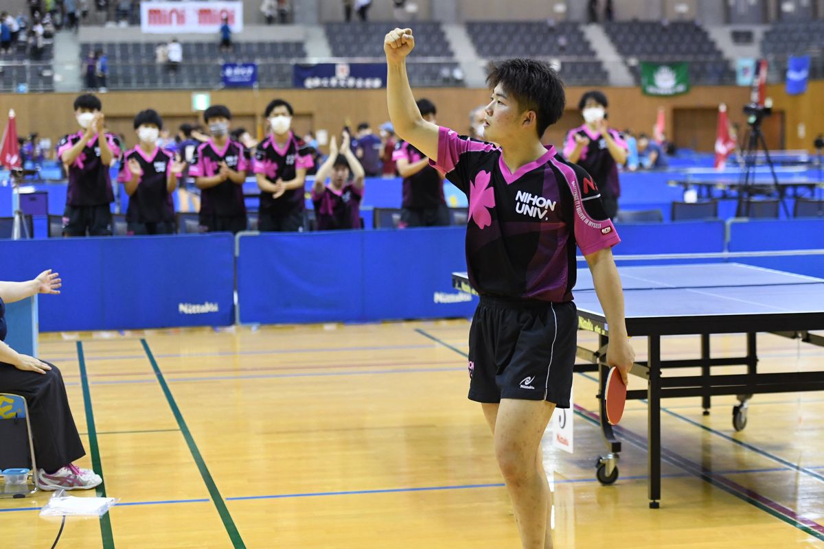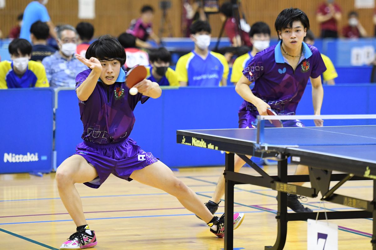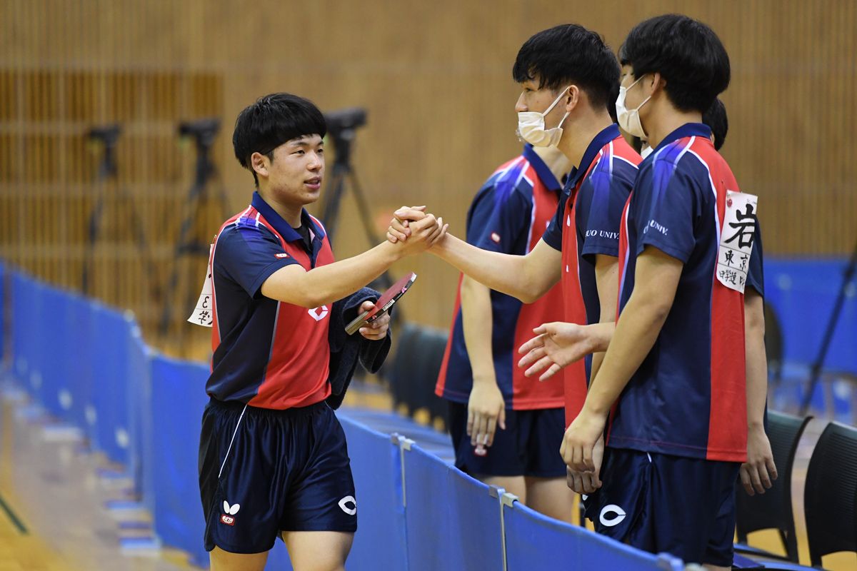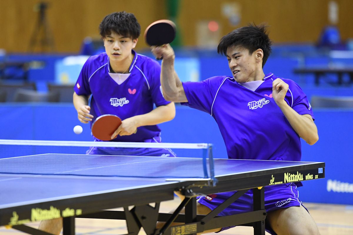 明治大学は、準々決勝で宇田幸矢/戸上隼輔のダブルスが、立命館大学の三浦竜樹/三谷尚輝に0対2と追い詰められたが、世界卓球3位、全日本王者の意地を見せて逆転勝ちを収めた。