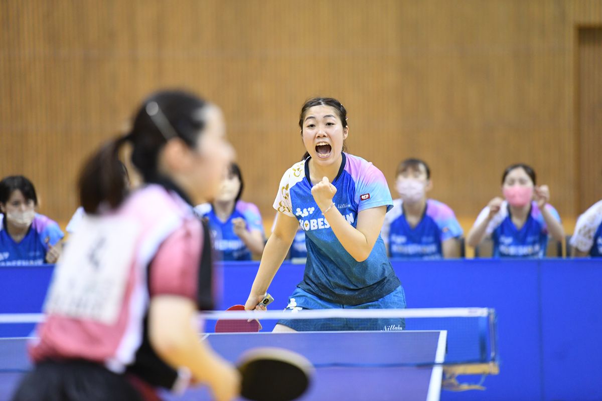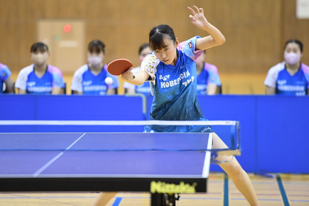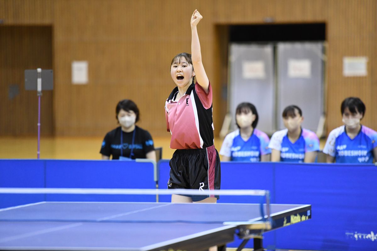 1番のエース対決で神戸松蔭女子学院大が先制したものの、カット主戦型の山本が粘り強く戦って木塚を破り1対1に。