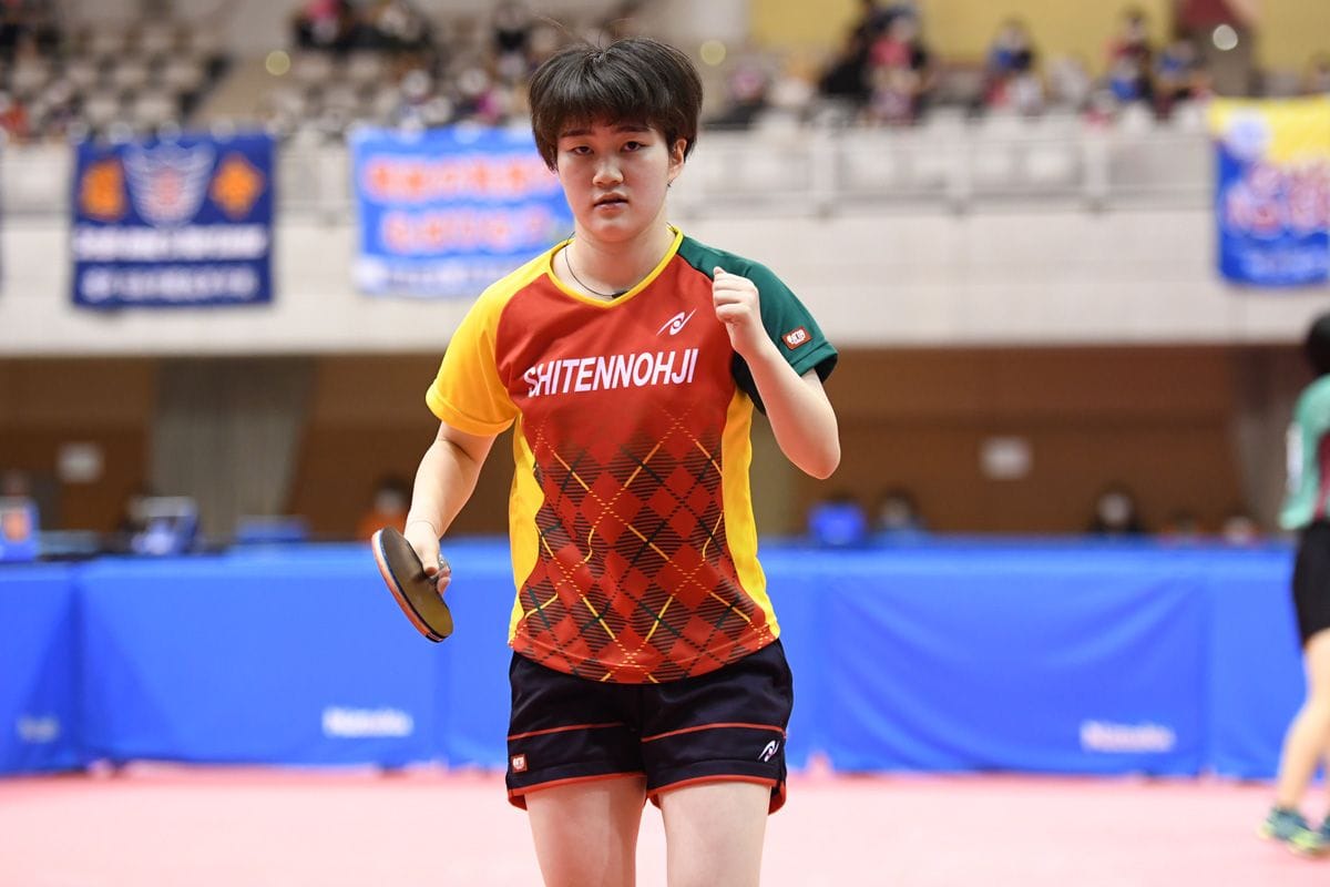 女子ダブルスで2位、女子シングルスでもランク入りするなど、活躍著しい小林りんごが四天王寺に唯一土をつけた。変化のわかりにくいカットに加え、中陣からの意外性のある攻撃も得点源にして、サウスポーの伊藤を破り、前半で貴重な1点を挙げた。
