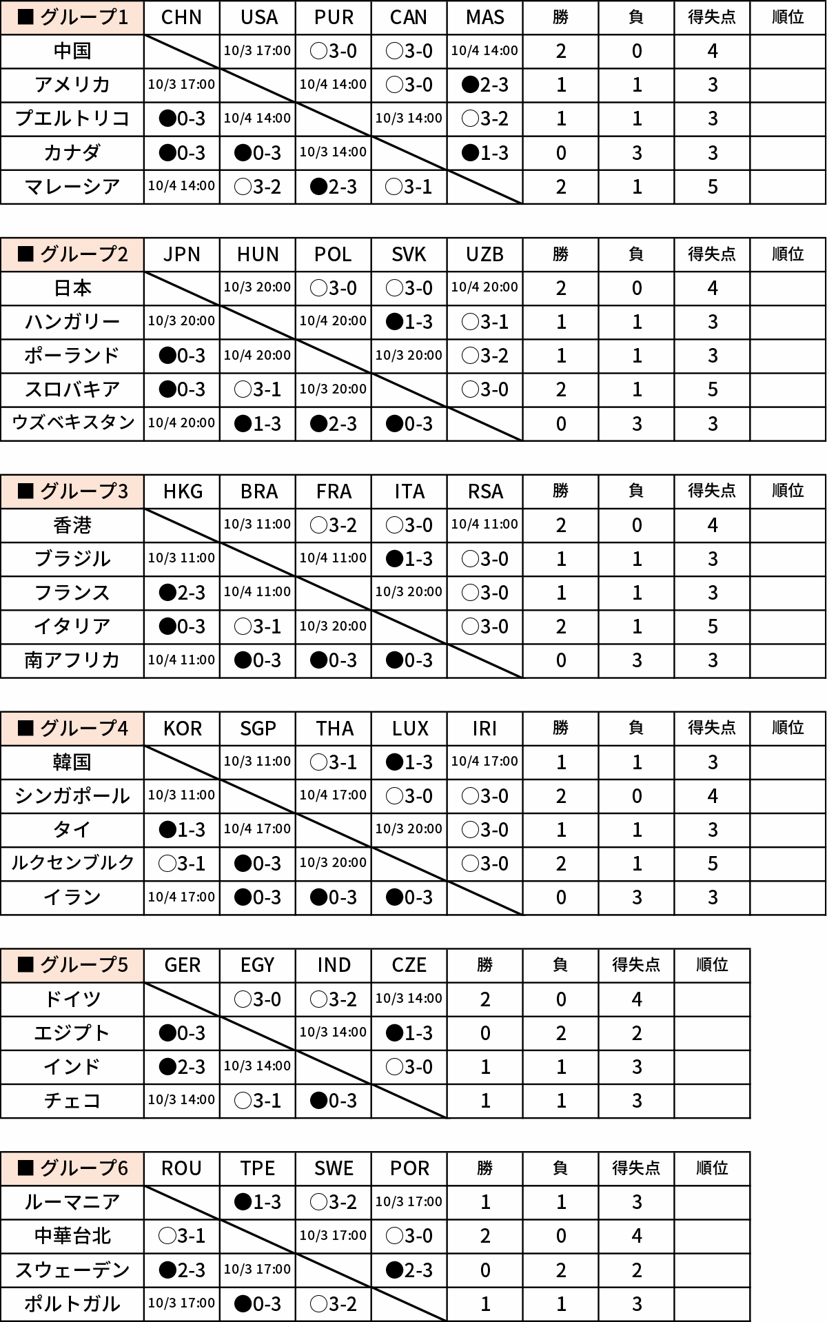 競技3日目の10月2日は、女子団体予選グループリーグで日本がポーランドをストレートで退け2勝目を挙げた。