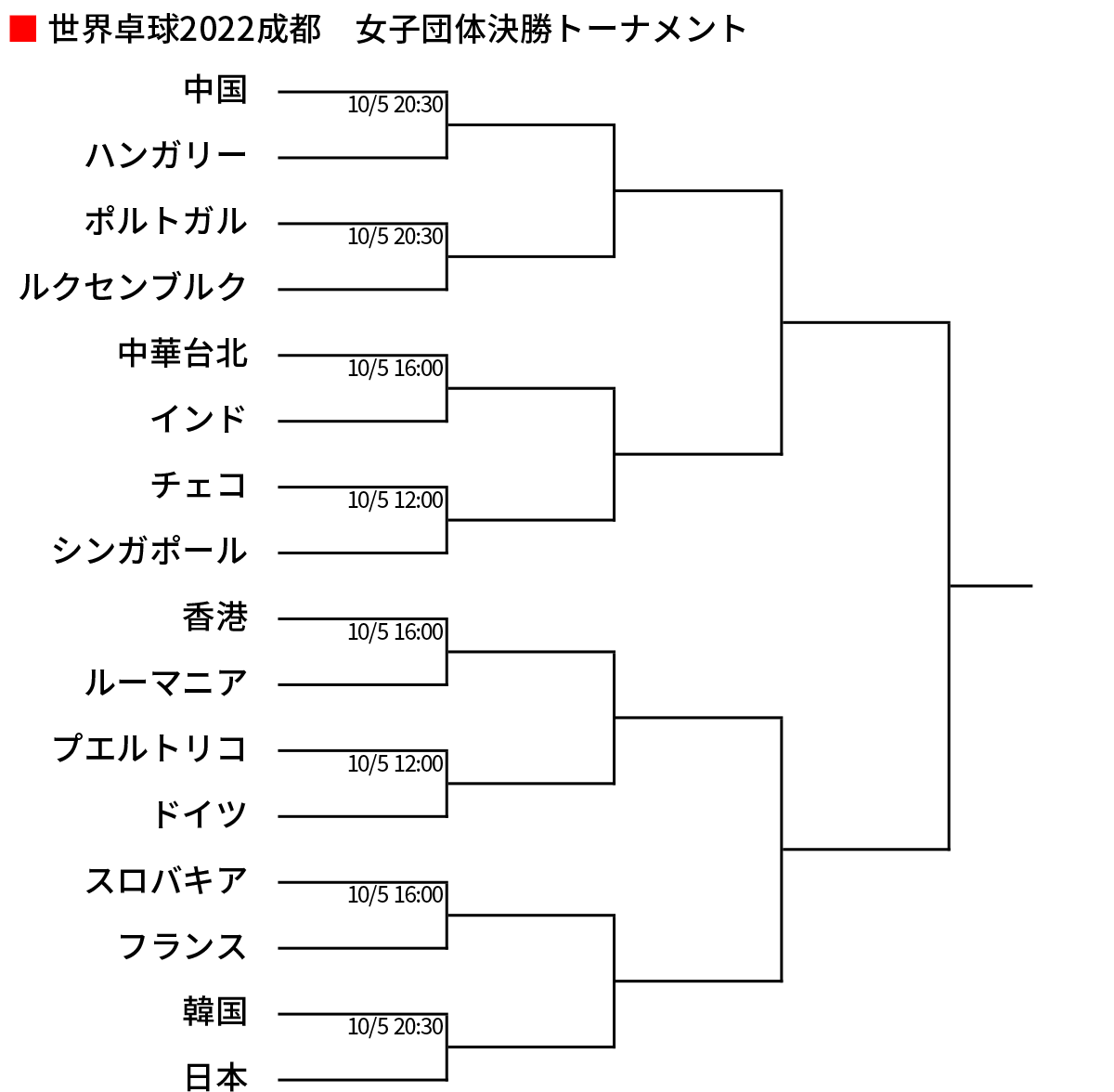 第4シードブロックは、アジア勢が3チームそろいました。注目は、中華台北対インド。鄭怡静や陳思羽などオーソドックスな右シェークドライブ型の選手をそろえた中華台北に対して、インドは、ツブ高のバトラやスマッシュを多用する選手が多く、面白いゲーム展開が予想されます。シンガポール対チェコは、グループリーグの戦いぶりからシンガポール有利と見ています。