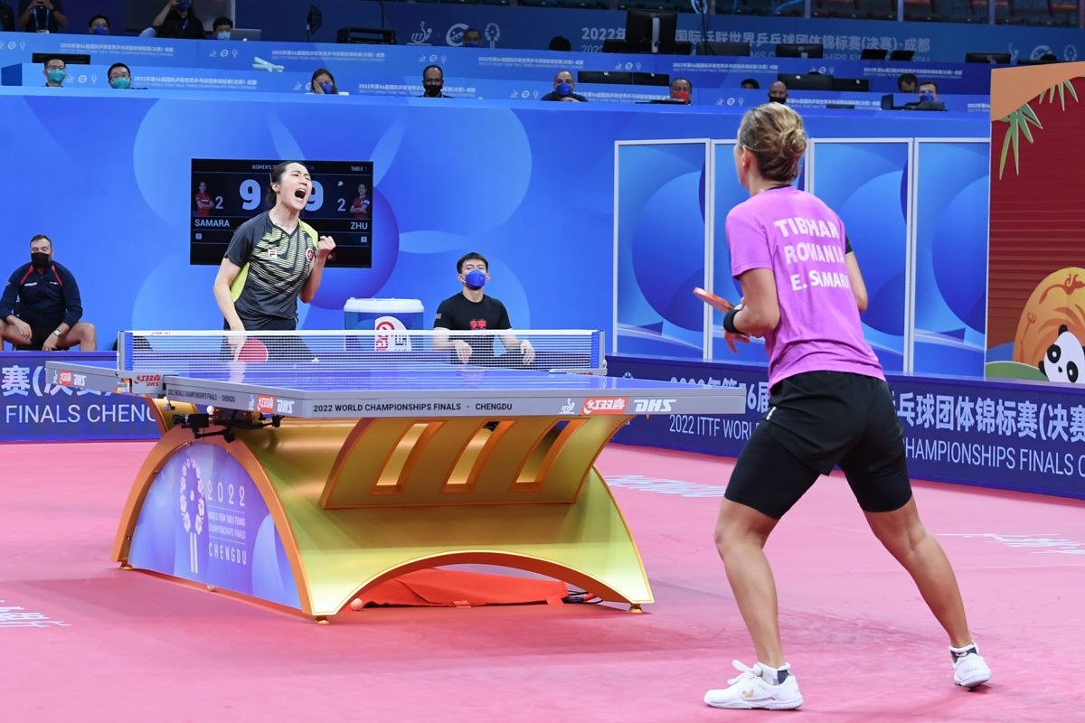 実力伯仲の両チームの対戦は、案の定ラストまで回り、朱成竹対サマラの対決となりました。ベテランらしいサマラの緩急をつけた変化に富んだラリーに対して、カウンタープレーをしたい朱成竹がタイミングを合わせることができず、勝負は最終ゲームにもつれ込みました。「ここが勝負どころ」とサマラが攻めに転じたポイントをカウンターで待っていた朱成竹に勝利の女神が微笑み最後は11-9で勝利。世界卓球らしいアジア対ヨーロッパのプレーを存分に味わうことのできた好ラリー満載の一戦でした。