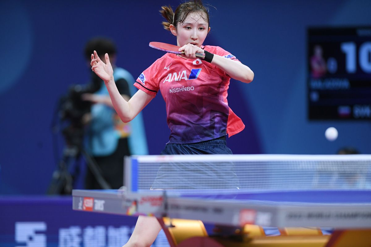 サウスポー対決となった早田対バラゾバは、ヨーロッパ選手の中でもパワーのあるバラゾバ(世界ランキング48位)が、サービスや台上の変化でチャンスを作り、パワーボールで得点に繋げる戦術で早田を苦しめました。しかし、ゲーム終盤に集中力の高さを見せる早田は、第1ゲームを6-9から逆転勝利。第2ゲームも取り、王手をかけましたが、第3ゲームはバラゾバに7連続得点を許すなど、なかなかプレーにキレが出ませんでしたが、しっかり第4ゲームを取り返して3対1で勝利しました。決勝の中国戦を見据えると、苦しい試合を今のうちに乗り越えることができたのはよかったかもしれません。ツインエースの早田が上昇気流に乗っていくために必要な試合だったと思います。