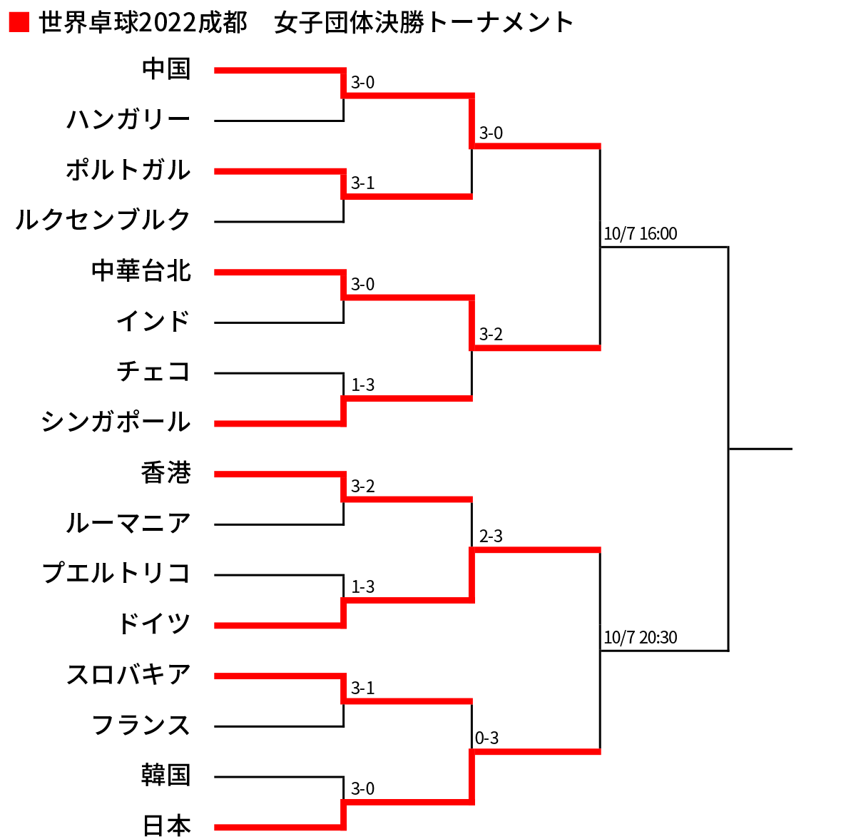 準々決勝もベストメンバーで臨んだ中国チームは、ポルトガルチームに一度もリードを奪わせない試合展開で完璧にシャットアウトしました。中国はおそらく決勝までこのベストメンバーで臨むのでしょう。陳夢、王曼昱、孫穎莎の3人は、全員がスピードとパワーを兼ね備えており、今のところすきが見当たりません。