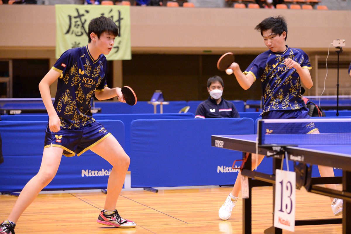 思い切りのいい郡司のバックハンドと安定感のある月原のフォアハンドで愛工大名電中ペアが2対1とリードしたが、中判から伊藤の台上プレーと岡本の両ハンド攻撃の連係がかみ合ってきた木下アカデミーペアが優勢に。最終ゲームは5対0とリードした木下アカデミーペアが、郡司/月原の追い上げを振り切って初優勝を手にした。
