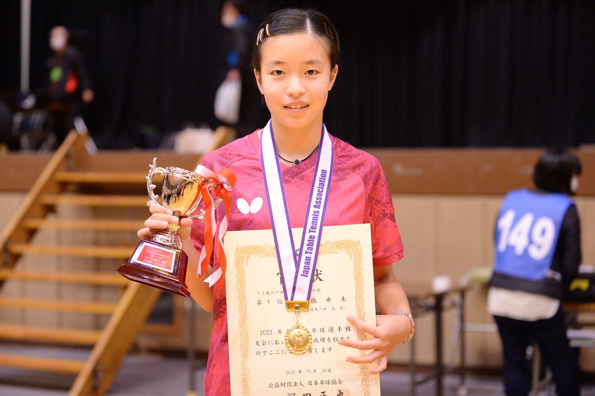 大会最終日はシングルス各種目の5回戦〜決勝が行われ、13歳以下女子シングルスは佐藤希未(貝塚第二中)が初優勝を飾った。