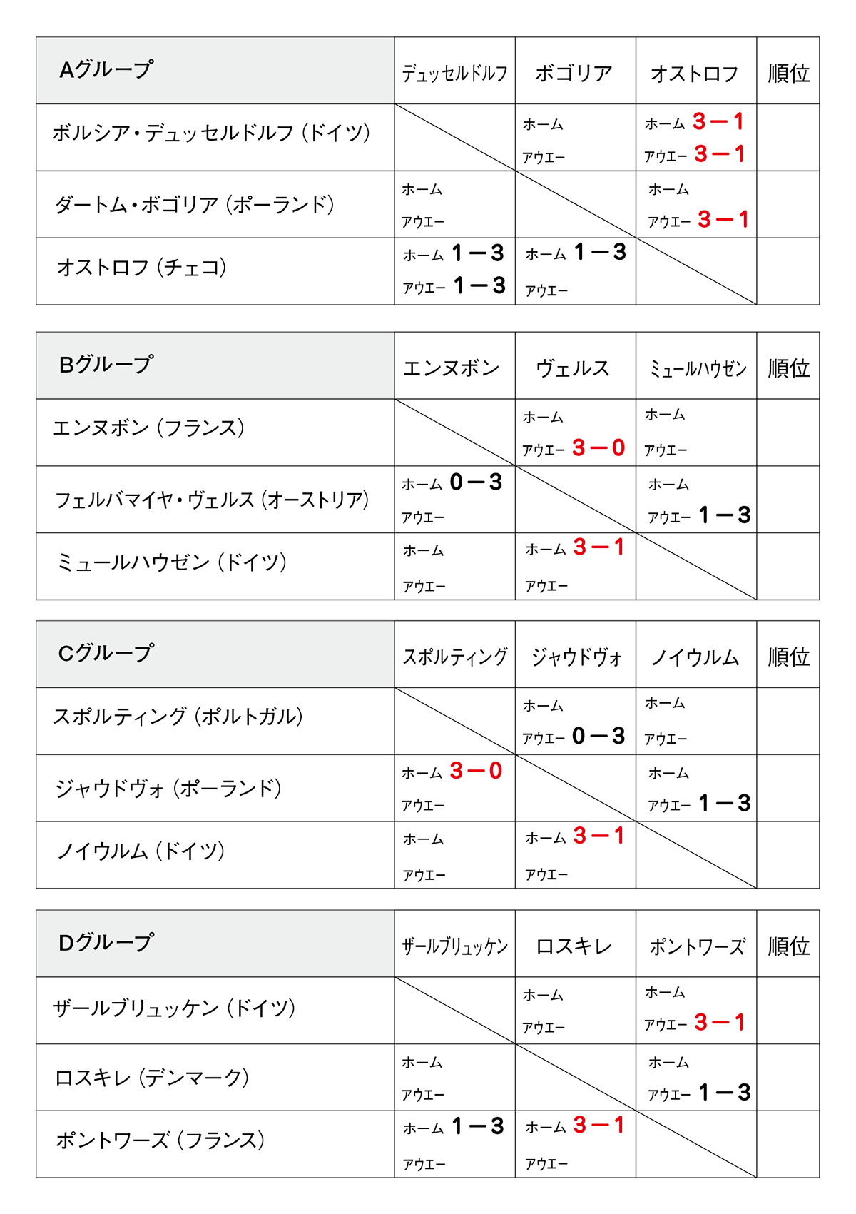 11月17日【Aグループ】はアウエーのボルシア・デュッセルドルフ(ドイツ)が3-1でオストロフ(チェコ)に勝利した。ケルベリ、シュトゥンパー、ダン・チウで臨んだデュッセルドルフは、ケルベリがトレグラーに勝利、ダン・チウがシルセクとOBESLOに勝利した。オストロフは、マルティンコがシュトゥンパーに勝って一矢報いた。