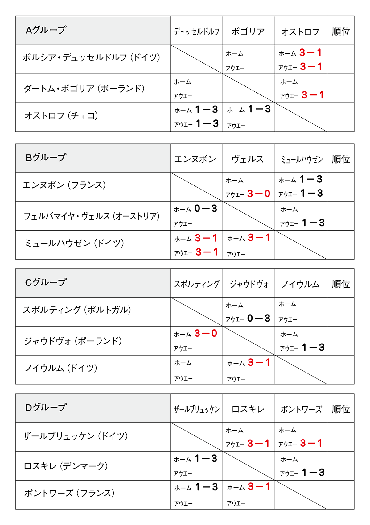11月23日【Dグループ】はアウエーのザーリュブルッケン(ドイツ)が3-1でロスキレ(デンマーク)に勝利した。ザーリュブルッケンはニュイティンクがルンクイストに勝利、フランチスカがメイスに勝利。小林広夢がHINDERSSONに敗れたものの、フランチスカがルンクイストとの接戦に勝利した。