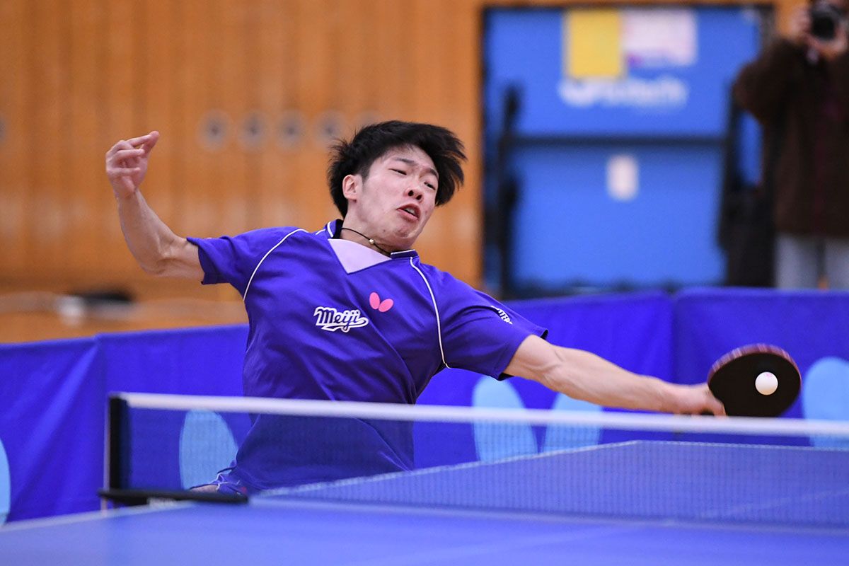 2位の松田歩真(明治大)は、岡野俊介、劉念(ともに朝日大)とのゲームオールの激戦を制し勝ち上がった。最後の最後まで自分のプレーに徹しフォアハンドドライブを振り続ける姿が胸を打つ。インカレ、関東リーグを制した明治大の意地を見せた。
