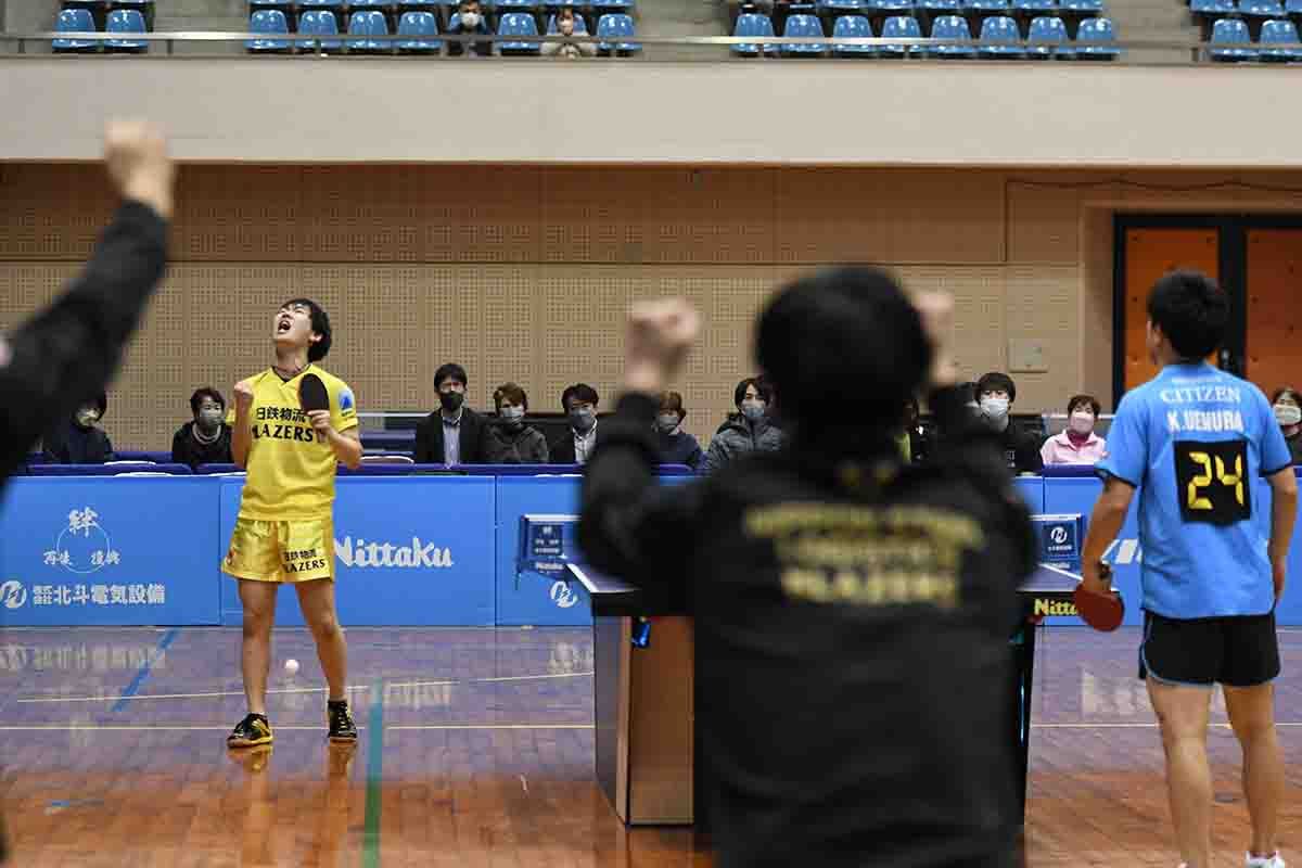 トップは藤村が得意のサービスからのラリーで上村を退け、日鉄物流ブレイザーズが先制する。
