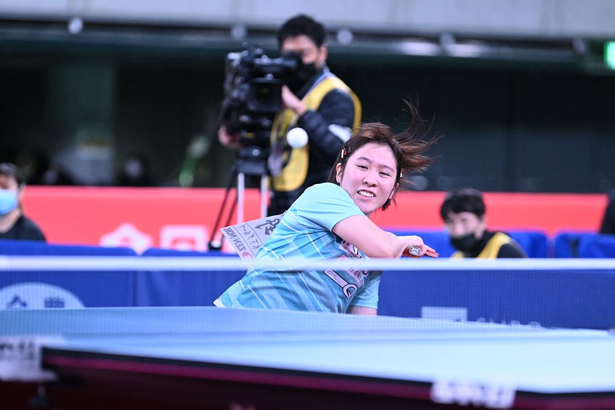 石川はカット主戦型の佐藤にゲームカウント4対1で勝利。「1ゲーム目をジュースで落として苦しかったんですけど、しょうがないと割り切って、それからはラリーで落としてもめげずに攻めていけたのがよかった」と石川。第2ゲーム以降、佐藤の打点の高いカットと突発的な攻撃にしっかり対応し、準決勝進出を決めた。