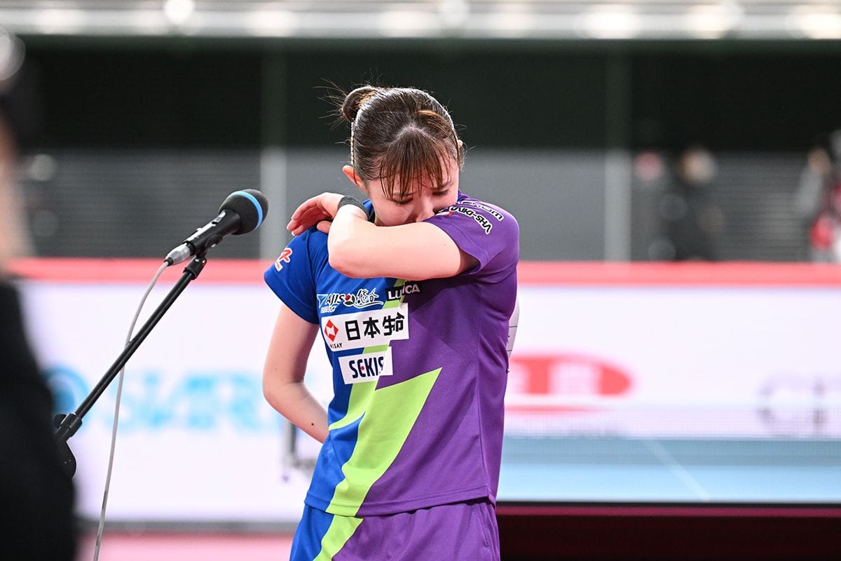 (観客に向けて)連日、たくさんの応援、本当にありがとうございました。皆さんの応援があって、選手たちも本当に楽しみで仕方がなかった全日本だったと思います。皆さんの前でこうやって優勝して、そして三冠を取ることができて、本当に嬉しく思います。今後も、私もそうですし、卓球界の応援をよろしくお願いします。ありがとうございました。