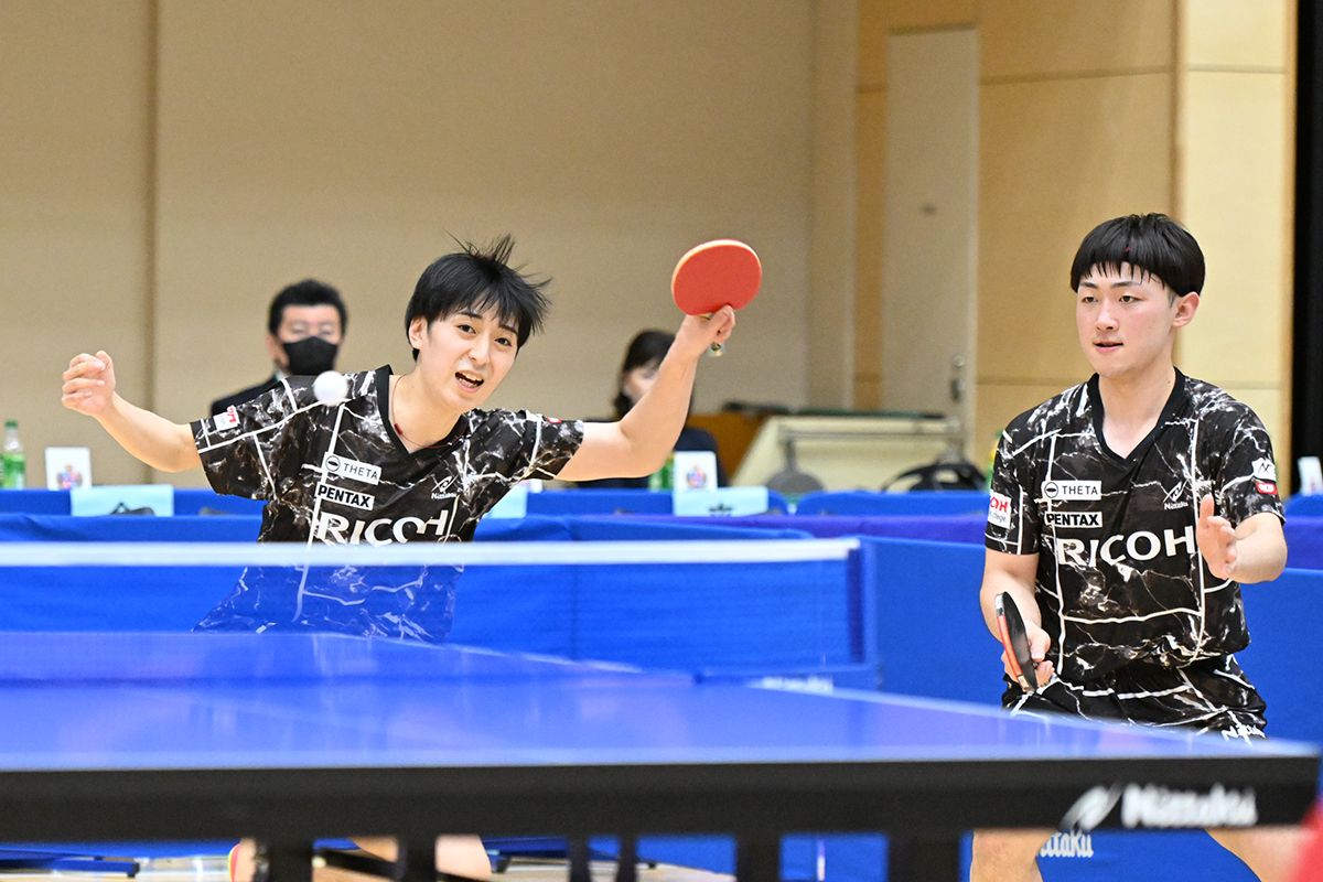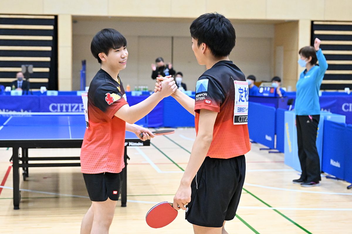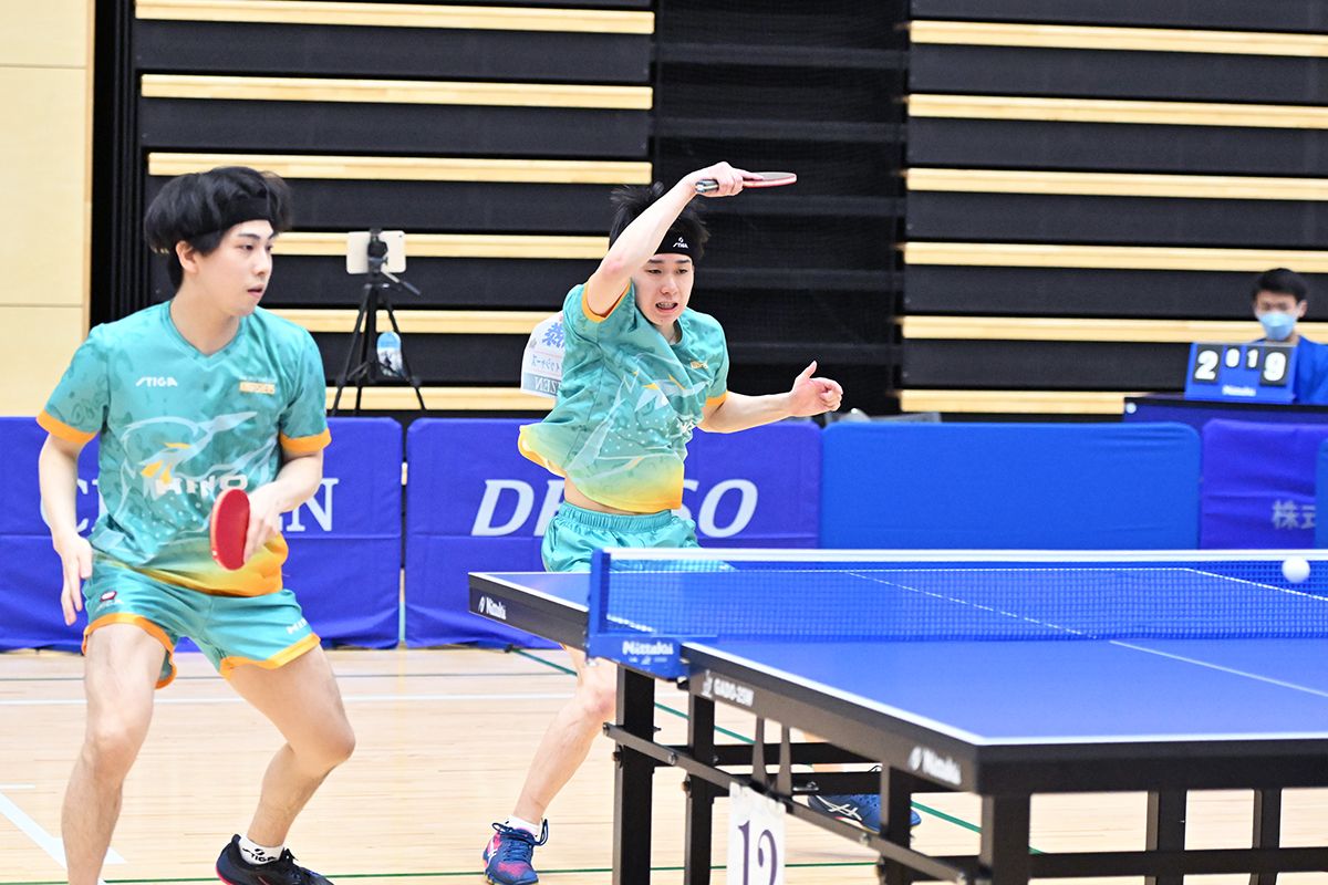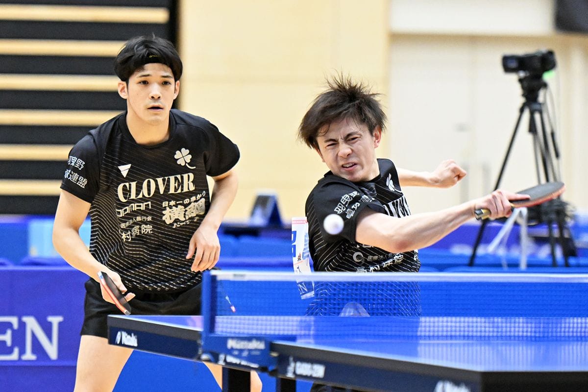 男子ダブルスを制したのは高見/定松。準々決勝で前回王者・藤村/松下との同士打ちをゲームオールで9本で切り抜け、勢いに乗った。決勝では郡山/小野寺のアグレッシブな連係に第1ゲームを先取されるが、慌てずににチキータからの両ハンドで得点を重ね、頂点をつかんだ。