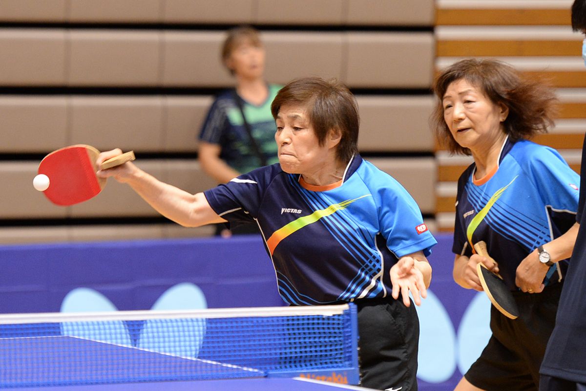 ダブルスA(60~109歳)は第1シードの佐藤・串間(四国銀行・おか柳、高知)が決勝トーナメントの初戦で宍戸・中田(中央クラブ・P.Pフレンズ、宮城)に敗れるなど、本命不在の混戦模様。