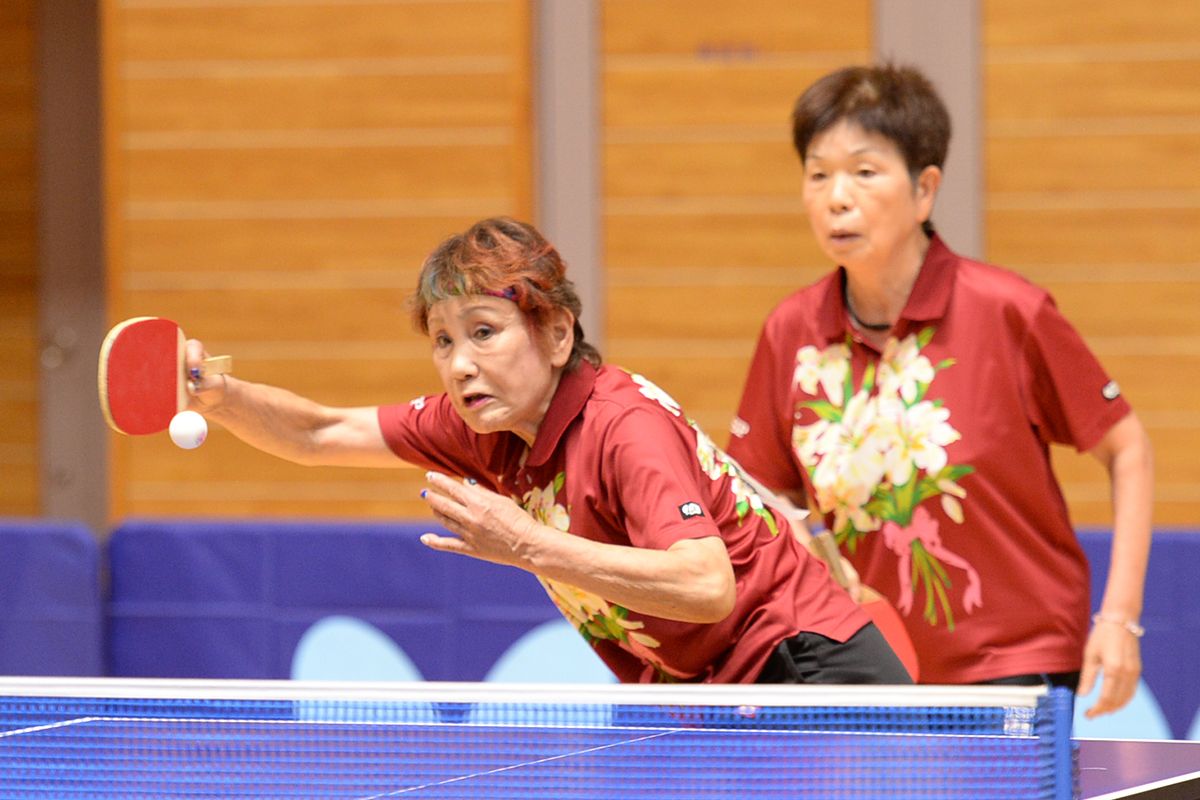 ダブルスA(60~109歳)は、宍戸/中田(中央クラブ/P.Pフレンズ・宮城)がカットペアの久世麻/久世愛(刈谷もくようクラブ・愛知)を見事な連係攻守で打ち破った。