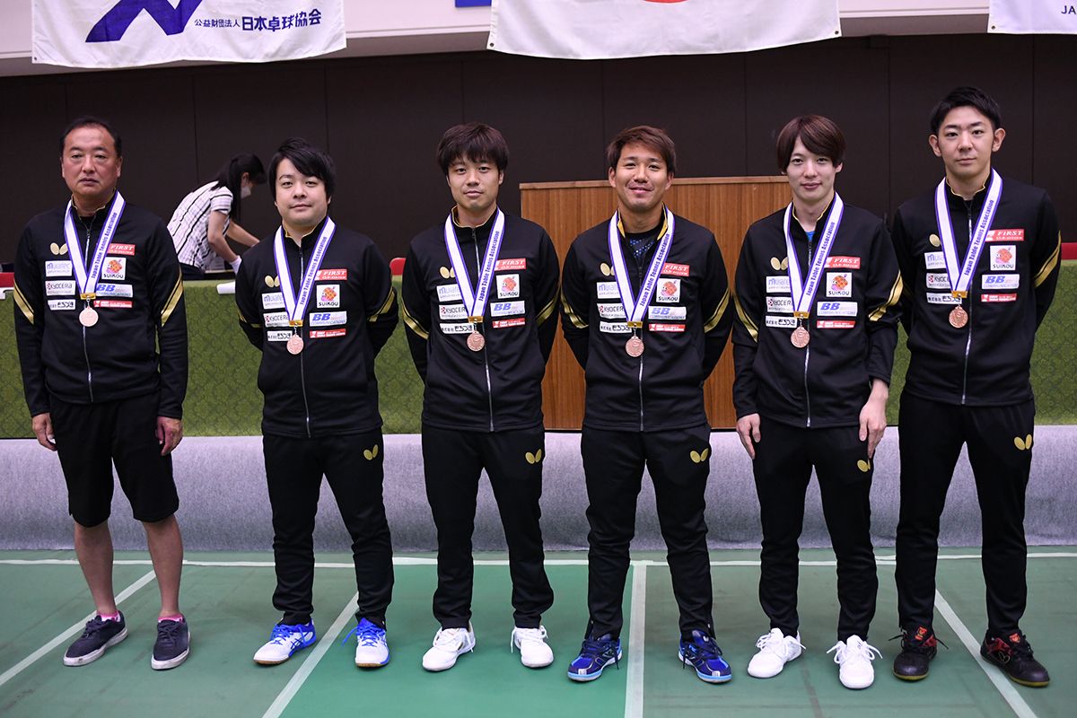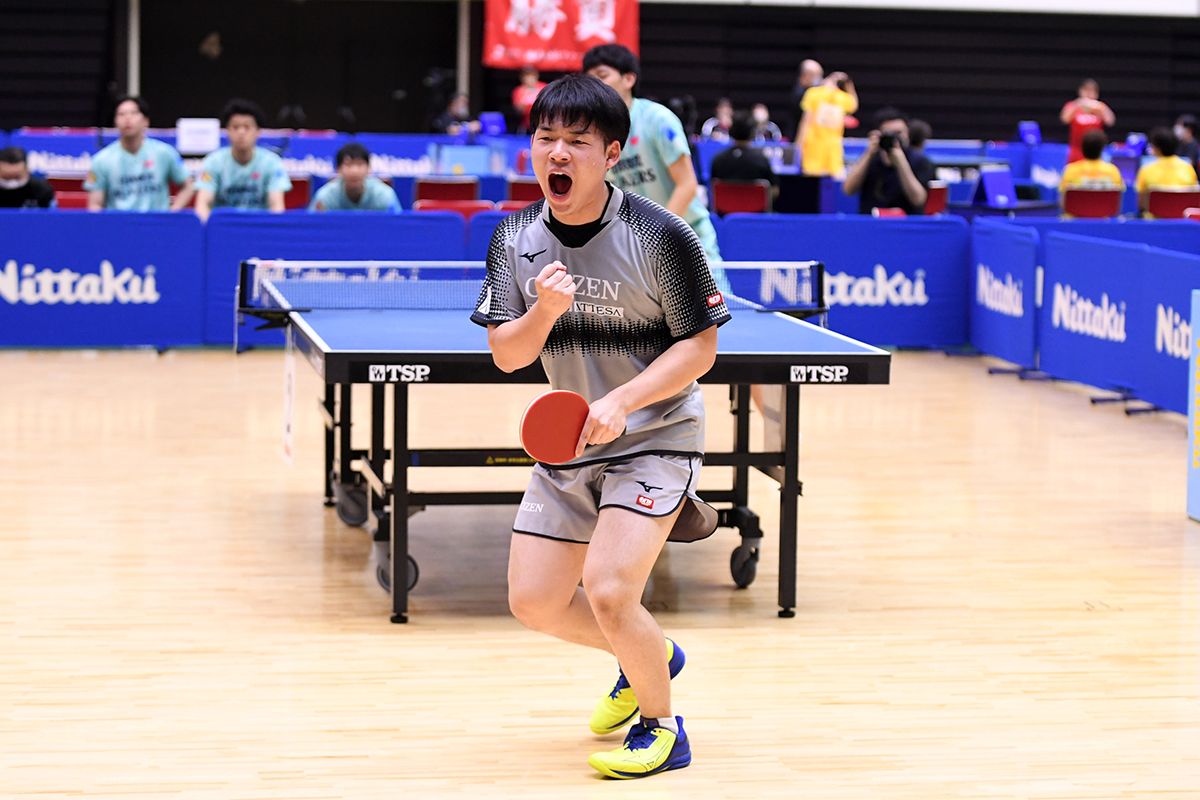すると今度は藤村友也をラストに置くという、ファースト戦とは真逆のオーダーを組んできた。試合はまたしても5番までもつれたが、ラストで藤村が三部航平とのゲームオールにもつれた接戦を、最後はフォア側に大きく飛びついた後、利き手とは逆の右手にラケットを持ち替えてスマッシュを決めるスーパープレーを決めて、勝利。大黒柱の藤村をおしげもなくラストに据える、まさに「杉井マジック」とでも言うべき的確かつ変幻の采配で接戦の連続をくぐり抜け、栄冠を勝ち取った。