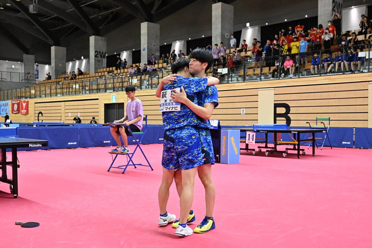 萩原とのダブルスは高1ぐらいからずっと組んでて、高2のインターハイはお互い鈴木(颯)さんと吉山(僚一)さんと組みましたが、高1の頃は2人で頑張ろうと出てすぐ負けちゃって、そこからエースダブルスとしてすごく練習してきました。組む機会もインターハイが終わったら、全日本ぐらいしかないので、絶対に優勝したいなと思ってて、最後の最後に優勝できたんでよかったです。