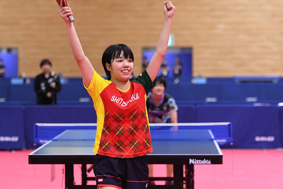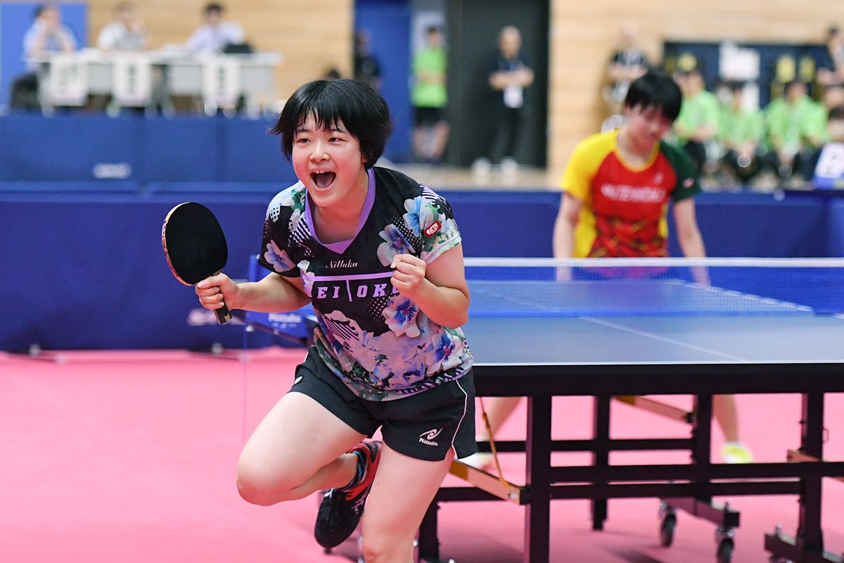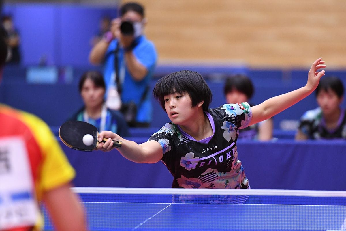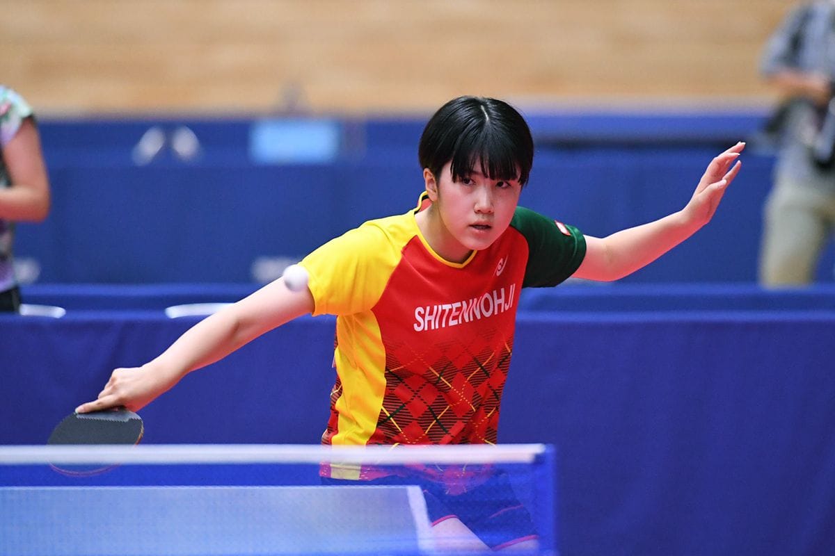 続く2番のルーキー青木咲智も、球威のある両ハンドで明徳義塾主将の中本杏月の前陣速攻を打ち崩し、四天王寺があっという間に王手をかける。