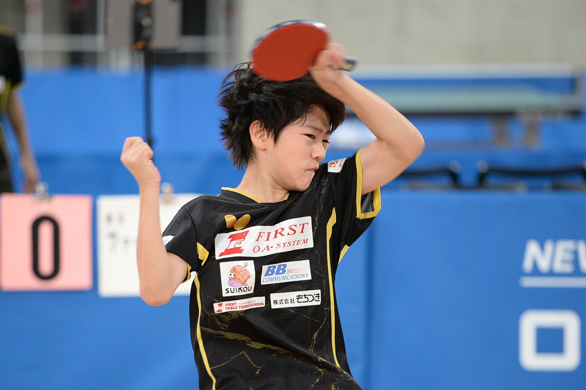 後半に中野と神原を配する宇土クラブに対して、ファースト卓球スクールはダブルスを勝って有利に進めたいところ。その期待に応えて濱野/中司が先手を取ってからの連係攻撃を見せ、丸岡/神原にストレート勝ちし、ファースト卓球スクールが初優勝に王手をかけた。