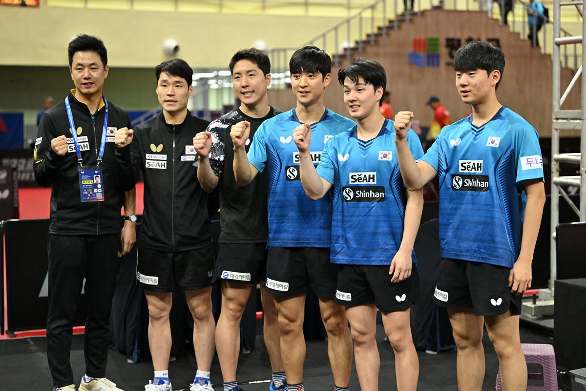 地元の韓国は、予選から勝ち上がってきたカザフスタンと対戦。1番の張禹珍はカザフスタンの2番手クルマンガリエフに0対2と追い込まれたが、地元の応援を背に粘り強いプレーで逆転勝ち。エースの重責を果たした。2番の林鐘勳は相手エースのゲラシメンコにゲームオールまで迫られるもしっかり競り勝つと、3番で安宰賢が快足を生かした強打を叩き込んでベスト4に勝ち上がった。