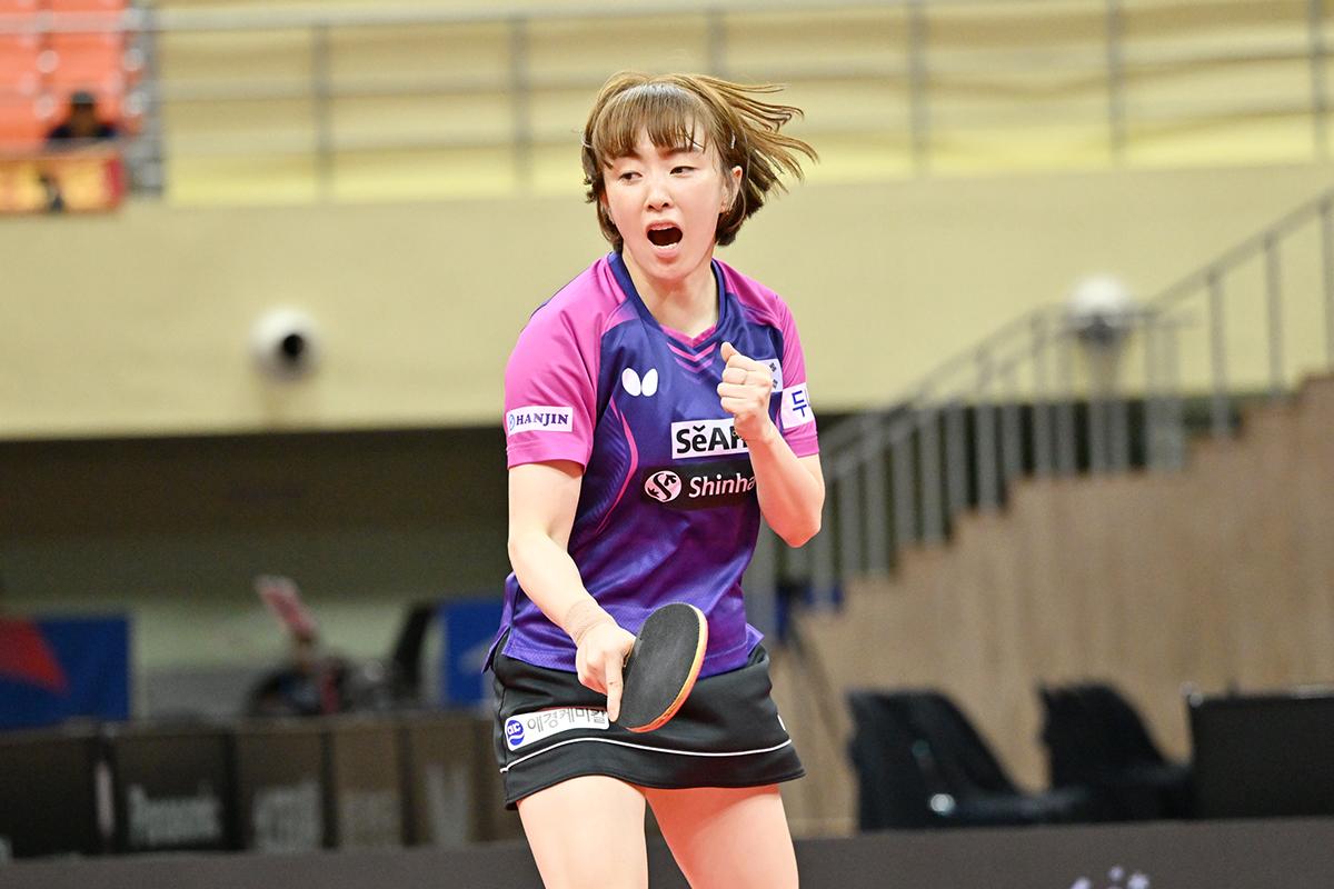 トップで徐孝元が円熟味の増したカットで李凱敏のスマッシュをしのぎきると、エースの申裕斌も躍動し、韓国が瞬く間に王手。続く3番の田志希も李皓晴との打撃戦を制し、全試合ストレート勝ちの完全勝利で決勝進出を果たした。