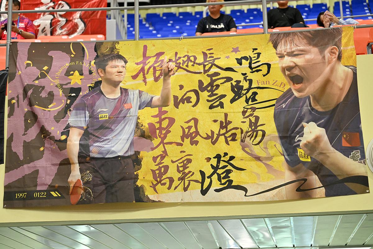 今大会は韓国での開催と言うことで、お隣の卓球大国・中国から選手を応援するファンが押し寄せている。2階の観客席には数多くの応援横断幕がかけられているが、その中でも世界チャンピオン・樊振東の幕が最も大きく、存在感を示している。