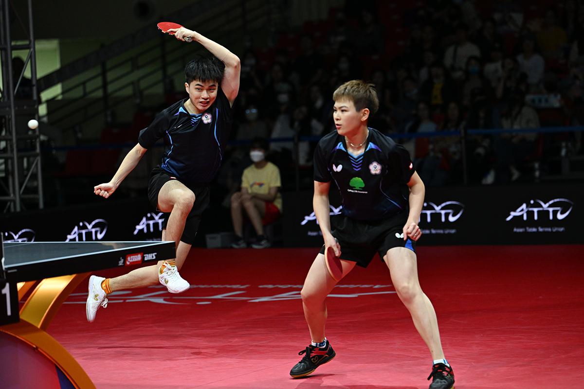 林高遠/王芸迪(中国)対林昀儒/陳思羽(中華台北)はゲームオール9本で中国ペアが勝利。中華台北ペアは、陳思羽がしっかりつなぎ、林昀儒が電光石火の両ハンドで仕留めるパターンで中国ペアを追い詰めたが、林高遠/王芸迪が中華台北ペアの鋭い攻撃を粘り強く返して接戦を勝ちきった。