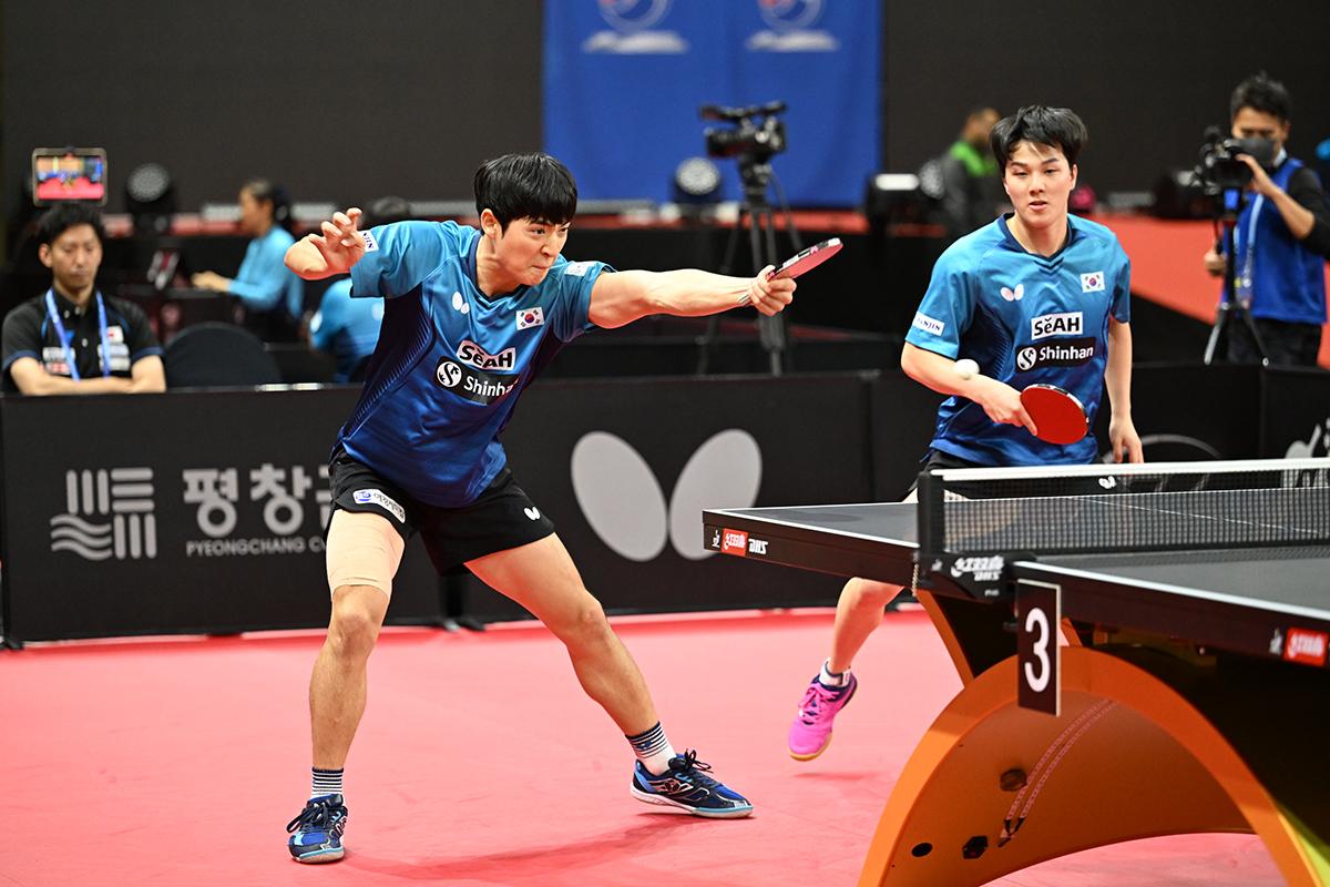 第1シードの張禹珍/林鐘勳(韓国)は、アラミヤン兄弟の強烈なYGサービスに流れをつかめず、0対2とピンチに陥る。しかし、ここから地元の大声援をバックに両ハンドをあきらめずに振り抜き、逆転で準決勝進出を決めた。