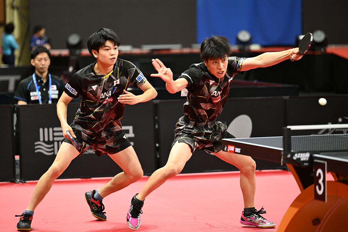 樊振東/林高遠(中国)は守備のうまいタッカー/シャー(インド)のブロックをものともせずに打ち抜き、ストレートで快勝。順当にベスト4へ勝ち上がった。