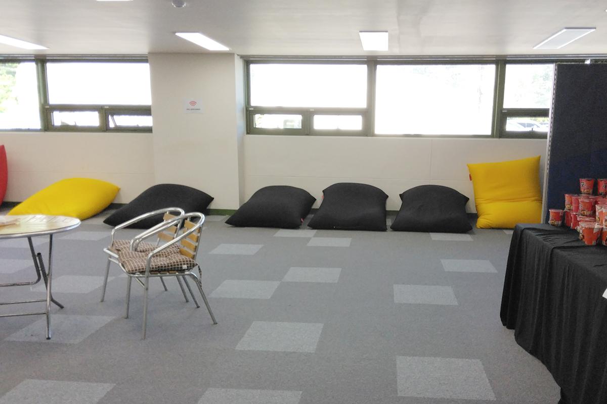選手専用のラウンジには軽食やカップ麺のサービスに加え、日本でも大人気のビーズクッションがズラリと並べられ、リラックスゾーンとして大人気だった。