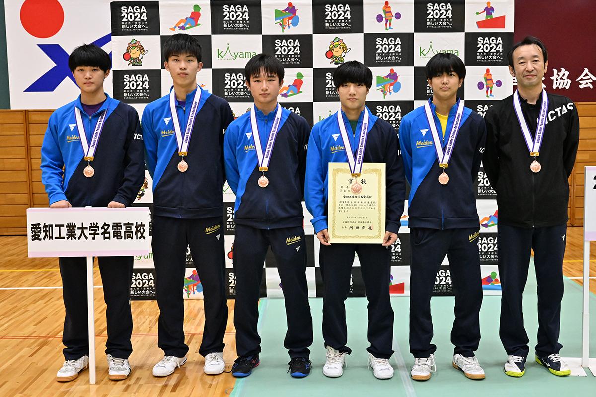 3位には、高校日本一の愛工大名電高が入った。準々決勝で実業団のクローバー歯科カスピッズを下して表彰台を勝ち取ったが、準決勝のファースト戦では2番でエースの萩原啓至が高木和に競り負けたのがひびき、ストレートで敗れた。