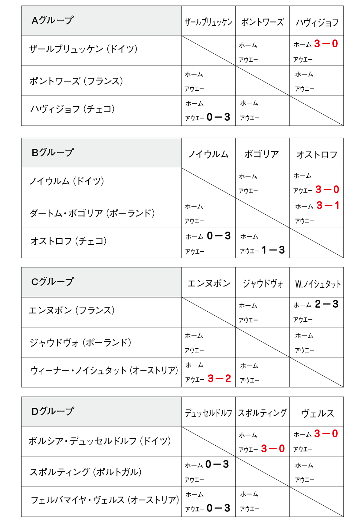 次の試合は11月19日。今度はノイウルムがホームでオストロフと対戦する。また、フェルバマイヤ・ヴェルス(オーストリア)とボルシア・デュッセルドルフ(ドイツ)が対戦する。
