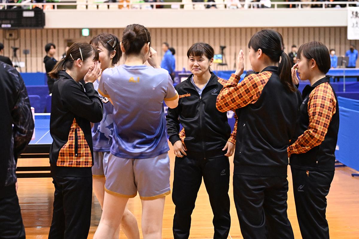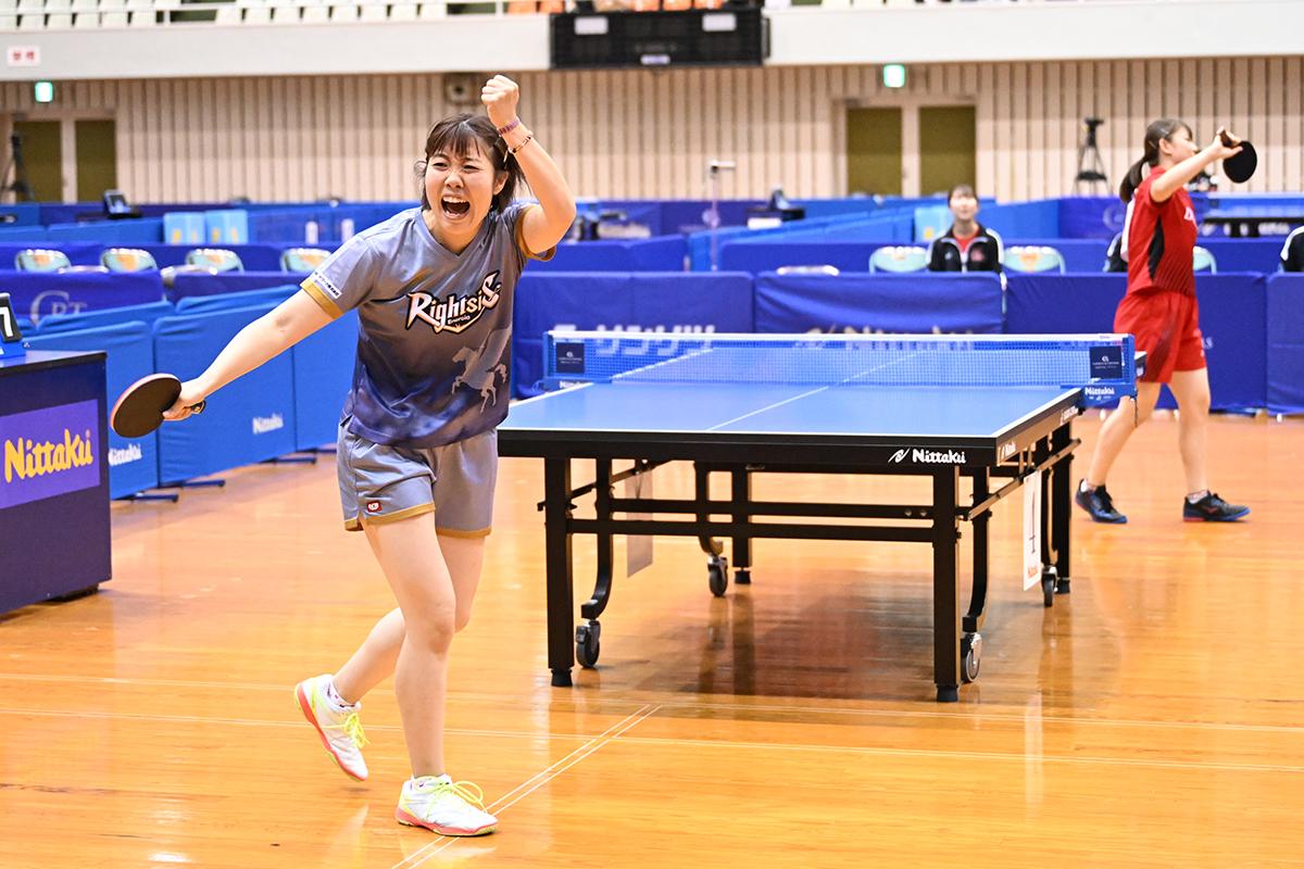 チームの充実ぶりが表れていたのが、最終戦となったデンソーとの一戦。このところ王座を明け渡してきたデンソーに対し、1番、2番を競り負けて全勝優勝が危うくなったが、3番で成本綾海/井絢乃が踏みとどまると、4番で成本が菅澤柚花里、ラストで枝廣瞳が小畑美月にそれぞれ気迫みなぎるプレーで競り勝ち、全勝を守った。