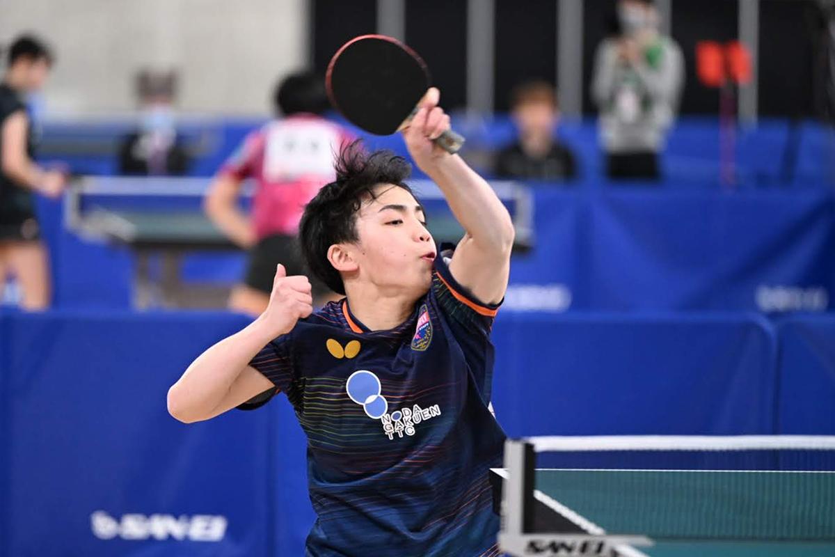 決勝までは危なげない勝ち上がりを見せたものの、決勝では同級生の吉山和希(岡山リベッツ)の鋭い両ハンドにゲームオールまで迫られる苦しい展開。最終ゲームも吉山の思いきった攻めに押し込まれる気配もあったが、「絶対フルゲームになると思っていたので調整できた」という松島が吉山の厳しい攻めに耐えつつ、勝負どころでチキータを決めて頂点をつかむと、静かに床に倒れ込んでしばし天井を見つめた。
