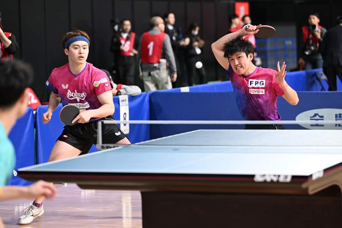 連覇を目指す張本智和/森薗政崇(智和企画/BOBSON)は、5回戦で加山裕/吉山僚一(日本大)とのゲームオールにもつれた接戦を切り抜けると、準々決勝では西康洋/川上尚也(日野キングフィッシャーズ)を下し、準決勝進出。競り合う場面も多いが、要所で得点を渡さない勝負強さを見せている。