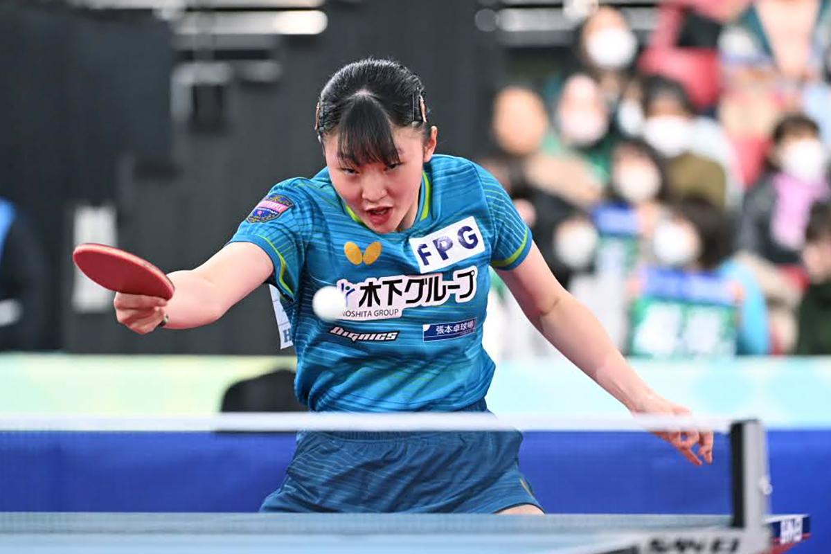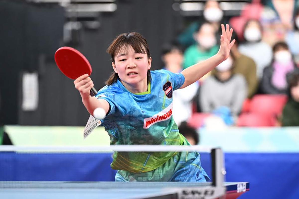 第1シードの早田ひな(日本生命)は長﨑美柚(木下グループ)にストレート勝利。長﨑の強烈なチキータをしっかり受け止め、バック対バックとフォアハンドの球威で圧倒して準決勝進出を決めた。