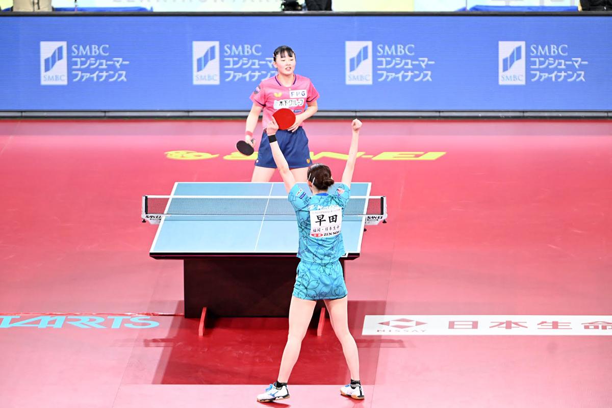 早田 大会始まる前はすごく緊張していたんですけど、試合に入るといろんな方に応援していただいて、やっぱりこうやって応援してもらえる中で卓球をするのが本当に好きだなと。もう1本1本、1ゲームずつかみしめて試合をしていたので、今日、本当に3階席までたくさんの方が応援に来ていただいて、今、東京めっちゃ寒いんですけど、本当に熱い試合を見ていただいて良かったなと思います、ありがとうございます。