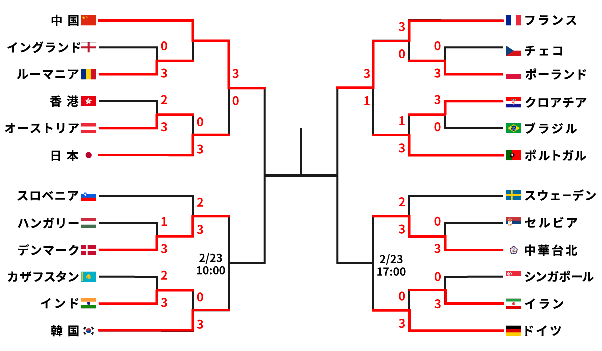 大会7日目となる2月23日は男子決勝トーナメント準々決勝2試合と女子決勝トーナメント準決勝の2試合が行われる。スケジュールは以下の通り。