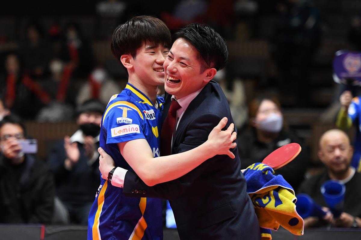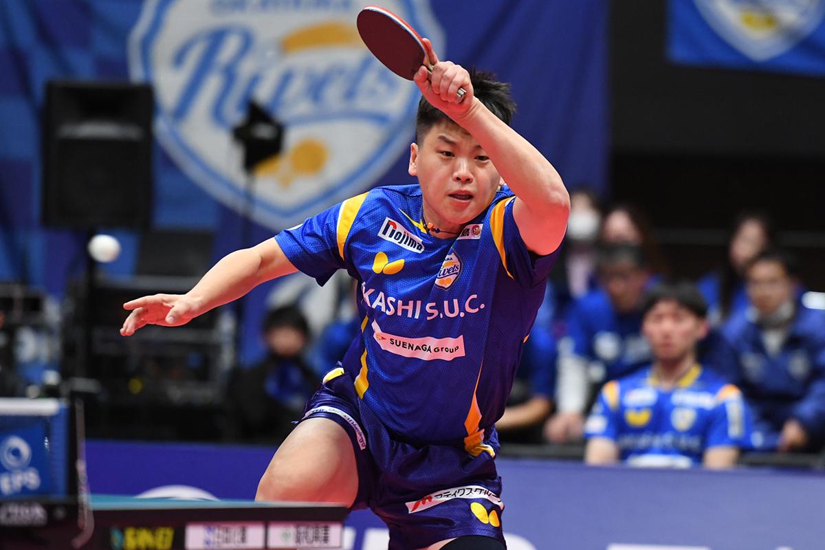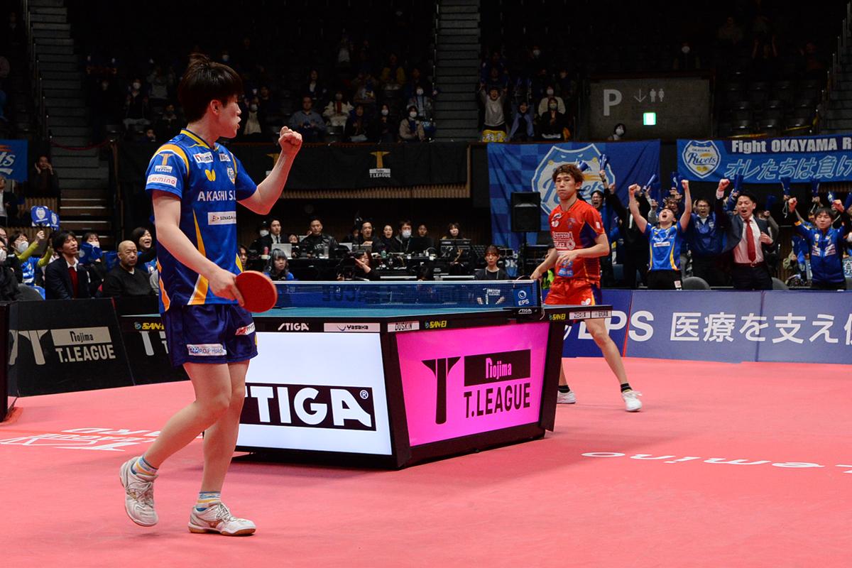 先行した琉球は徐晨皓が2試合続けて登場。追い付きたい岡山は大黒柱の郝帥を送り込んだ。両者は昨年12月のカードで対戦し、徐晨皓が郝帥に3対1で勝利を収めている。この試合も徐晨皓が強気のパワープレーで攻め込んで2対1と王手をかけるが、レギュラーシーズンのシングルス最多出場のタフガイ郝帥がしっかり動いて強打を決めてゲームオールに。最終ゲームも一進一退の攻防で8オールともつれるが、ここぞの場面でフォアで攻めた郝帥が競り勝ち、岡山が星を五分に戻した。