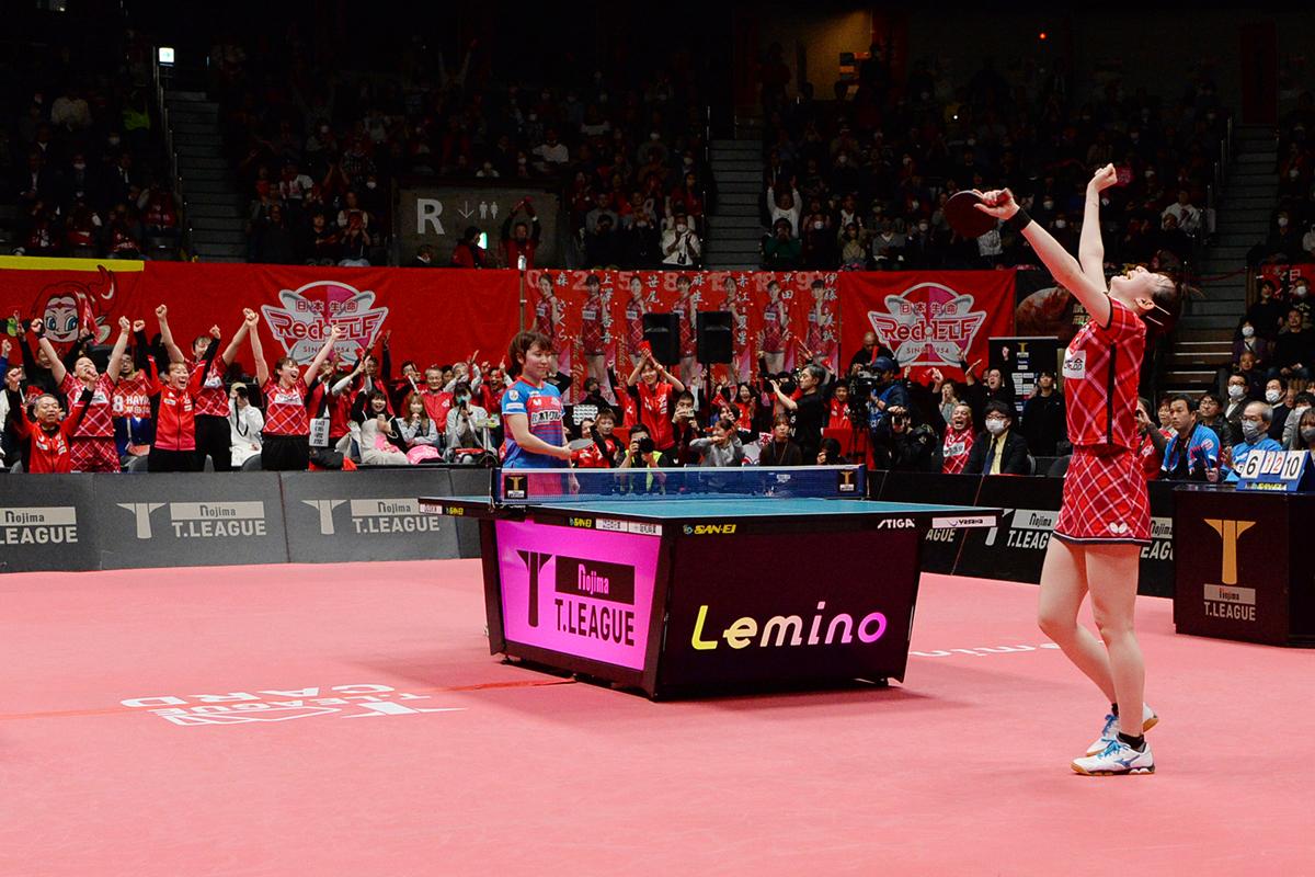 まだまだ後がない平野は第4ゲームも攻勢をかけて5対3とするが、このペースを許す訳には行かない早田がエンジンをかけ直し、一気に6本連取して流れを取り戻して6対9。流れを掴み直した早田がスパートして6対11で押し切り、日本生命レッドエルフが木下アビエル神奈川に3対0で勝利。昨シーズンのファイナルで敗れた借りを返し、見事に王座奪還を果たした。