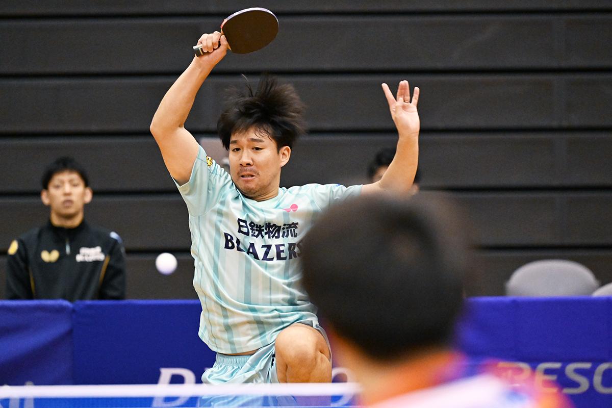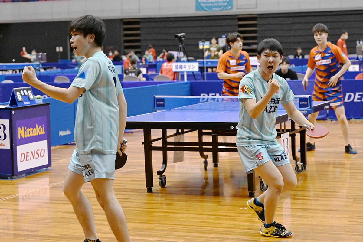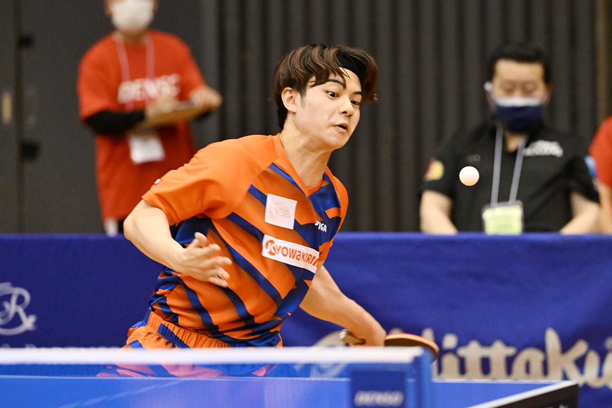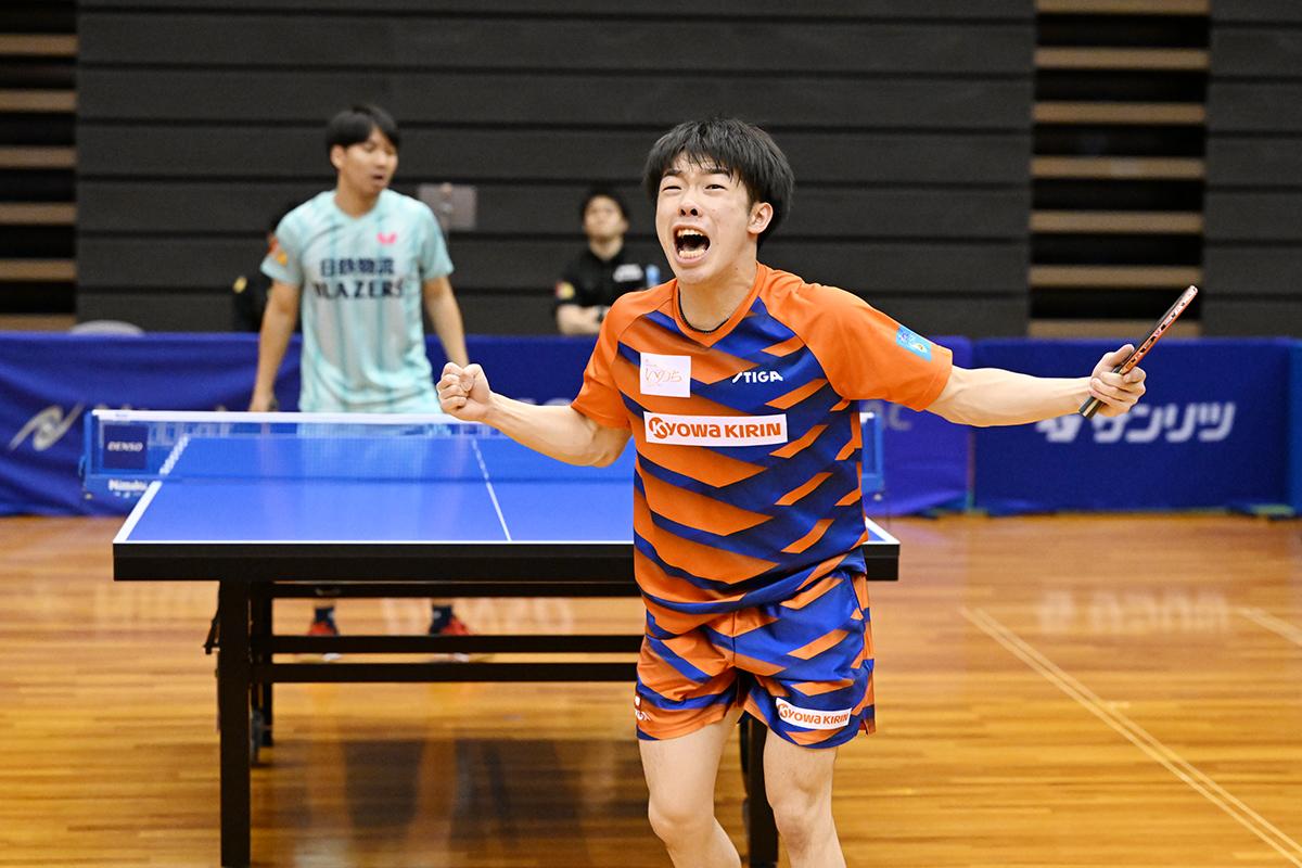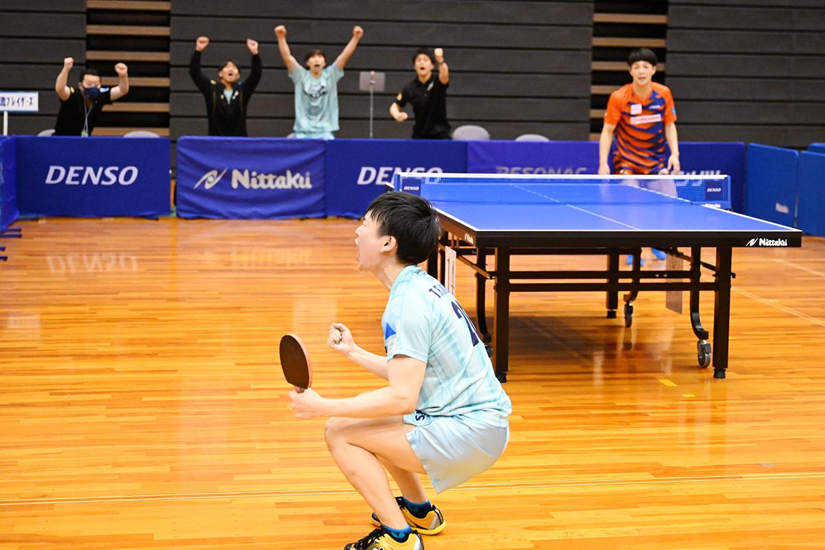 勝った方が栄冠を手にする大勝負は、1番で髙見真己が協和キリンのスーパールーキー、宇田幸矢を切れ味鋭い両ハンドで下すと、続く2番はゴールド(レンタル)選手の高木和卓が、宇田と同じくスーパールーキーの宮川昌大に競り負けるが、3番で藤村友也/髙見が渡辺裕介/宇田に勝利して王手をかける。