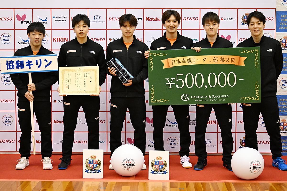 2位は5勝2敗で協和キリン。スーパールーキー宇田、宮川の加入で層がぐっと厚くなり、今大会では優勝に1番近いと見られていたが、優勝決定戦となった日鉄物流ブレイザーズ戦では宇田が単複で2点を落としのが響き、優勝には届かなかった。しかし、選手兼監督でまだまだ力のある松平、ラリー巧者のキャプテン・渡辺らに宇田、宮川が加わった布陣は強力で、今後も優勝争いの中心になるだろう。
