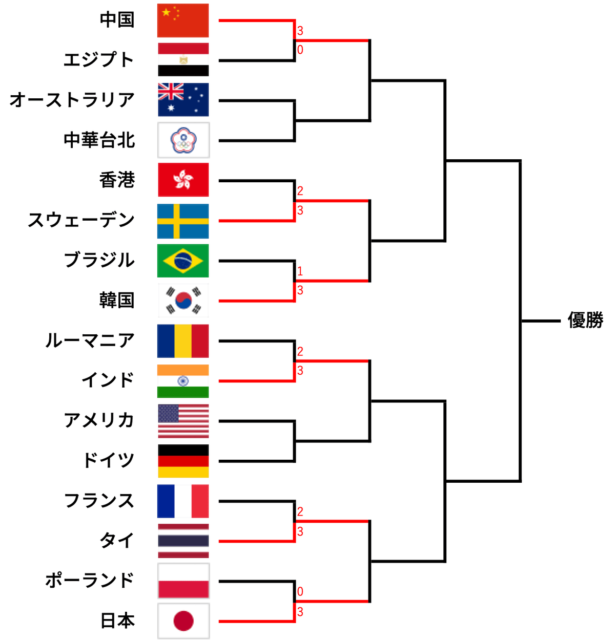 前回銅メダルの実力を持つ香港がスウェーデンに敗れたのも波乱と言えるだろう。スウェーデンは3番でケルベリが0対2からマッチポイントをしのいで杜凱琹を破る金星を挙げると、カット主戦型のベルグストロムが2点を加えてベスト8入り。