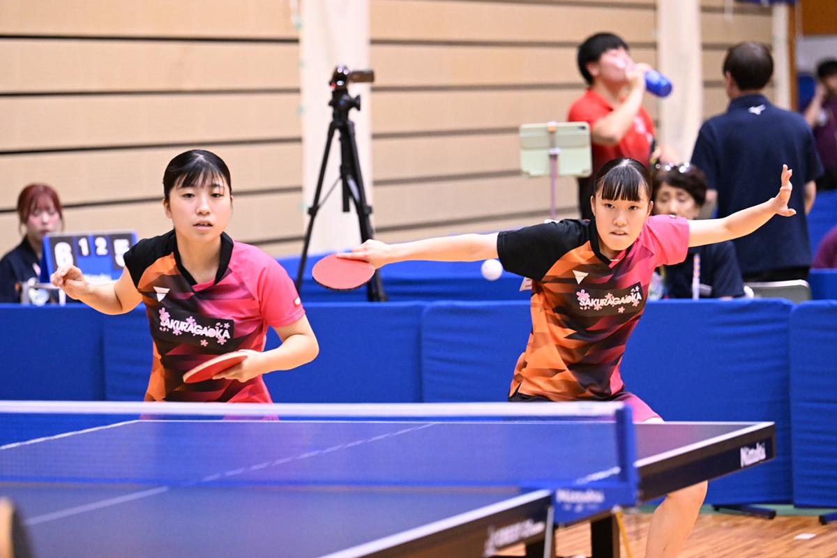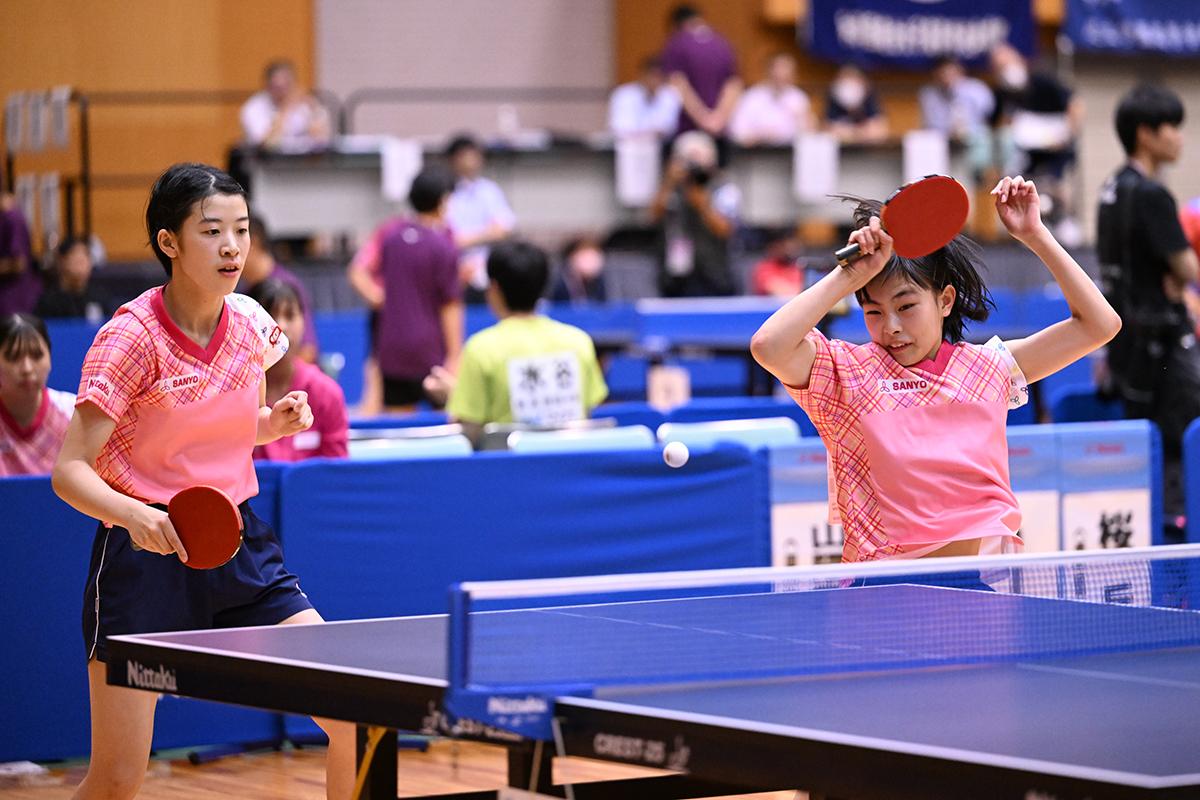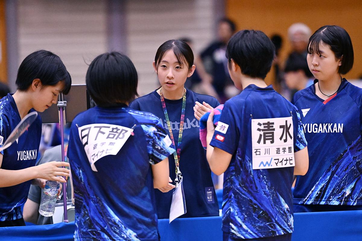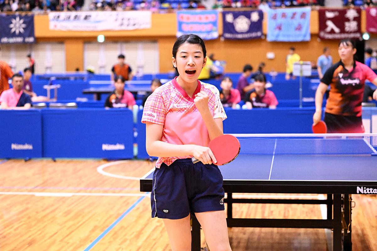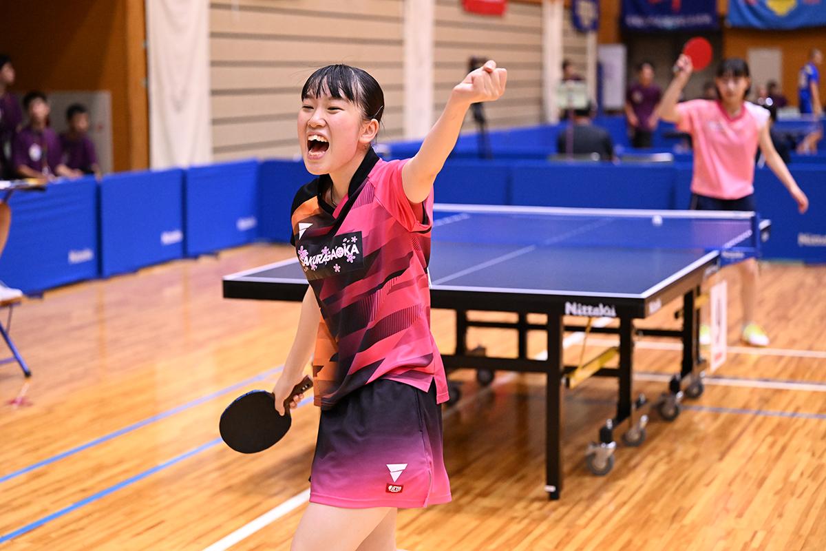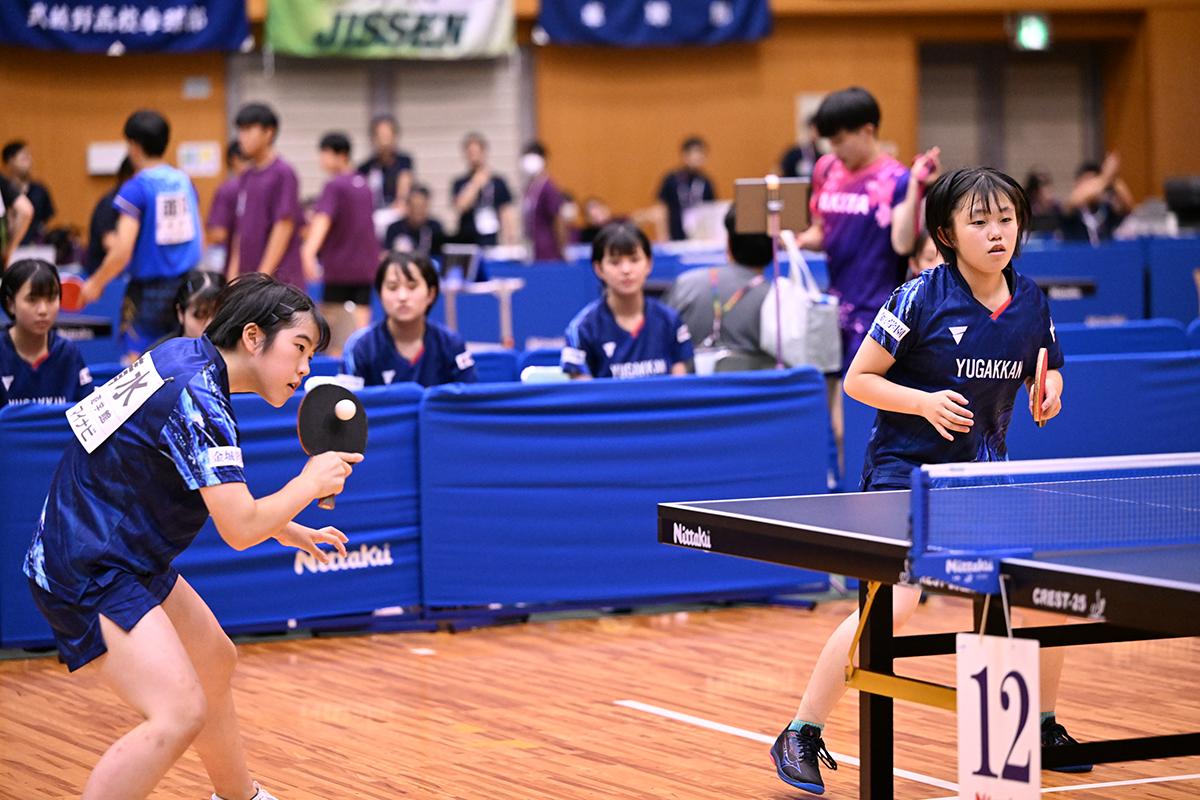 一矢報いたい遊学館は、日下部とカットの清水の変則ダブルスが、上澤/吉本に第1ゲームはジュースまで追いすがるが、吉本の伊藤美誠(スターツ)を思わせるようなトリッキーな台上と上澤のパワードライブの前にあと1点が遠く、第1ゲームを競り負ける。