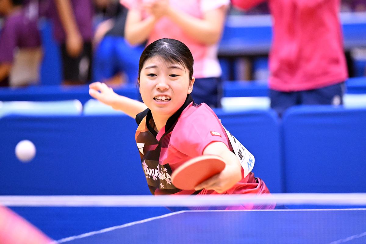 昨年の女子シングルス3位の田と全日本ジュニア2位の面手のトップは、準決勝にふさわしいハイレベルなラリー戦になる。第1ゲームは回転量の多い両ハンドで田が先制するが、田のボールに慣れ、上から押さえ込めるようになった面手が第2ゲームを返すと、第3ゲームを逆転で奪い、第4ゲームのジュースをしのぎきって山陽学園が先制する。