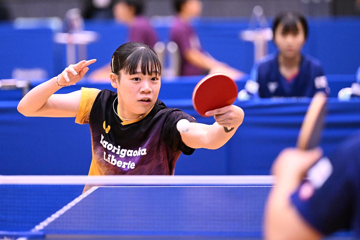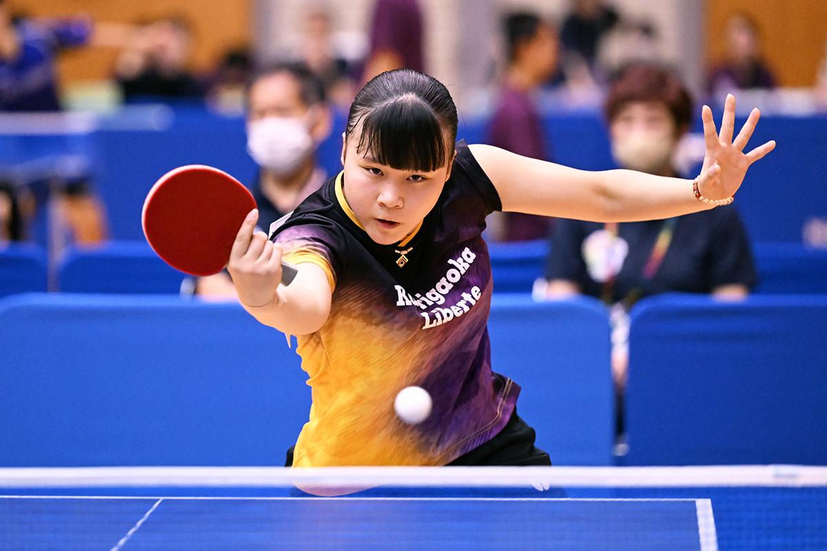 トップはリベルテが主将の上澤、遊学館は1年生エースの日下部を持ってきた。ともに左腕でバック面に表ソフトラバーを貼るシェーク異質型同士の対戦は、互いに厳しいコース取りで揺さぶる展開で各ゲームとも競り合うが、フォアハンドの球威でまさった上澤が要所を物にしてリベルテが先制。