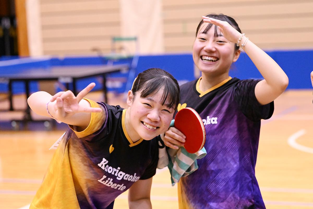 3番ダブルス、桜丘はここまで、個人戦の女子ダブルスで第1シードを張る栗山/田ではなく、栗山とカットの山室の変則ペアを組んできているが、この試合も栗山/山室で組んできた。対する山陽学園は絶対エースの面手と西川の速攻ペアだ。試合は好ラリーを繰り広げながら競り合うが、要所で山室が攻撃を決める桜丘がペアが第4ゲームのジュースを制して王手をかける。