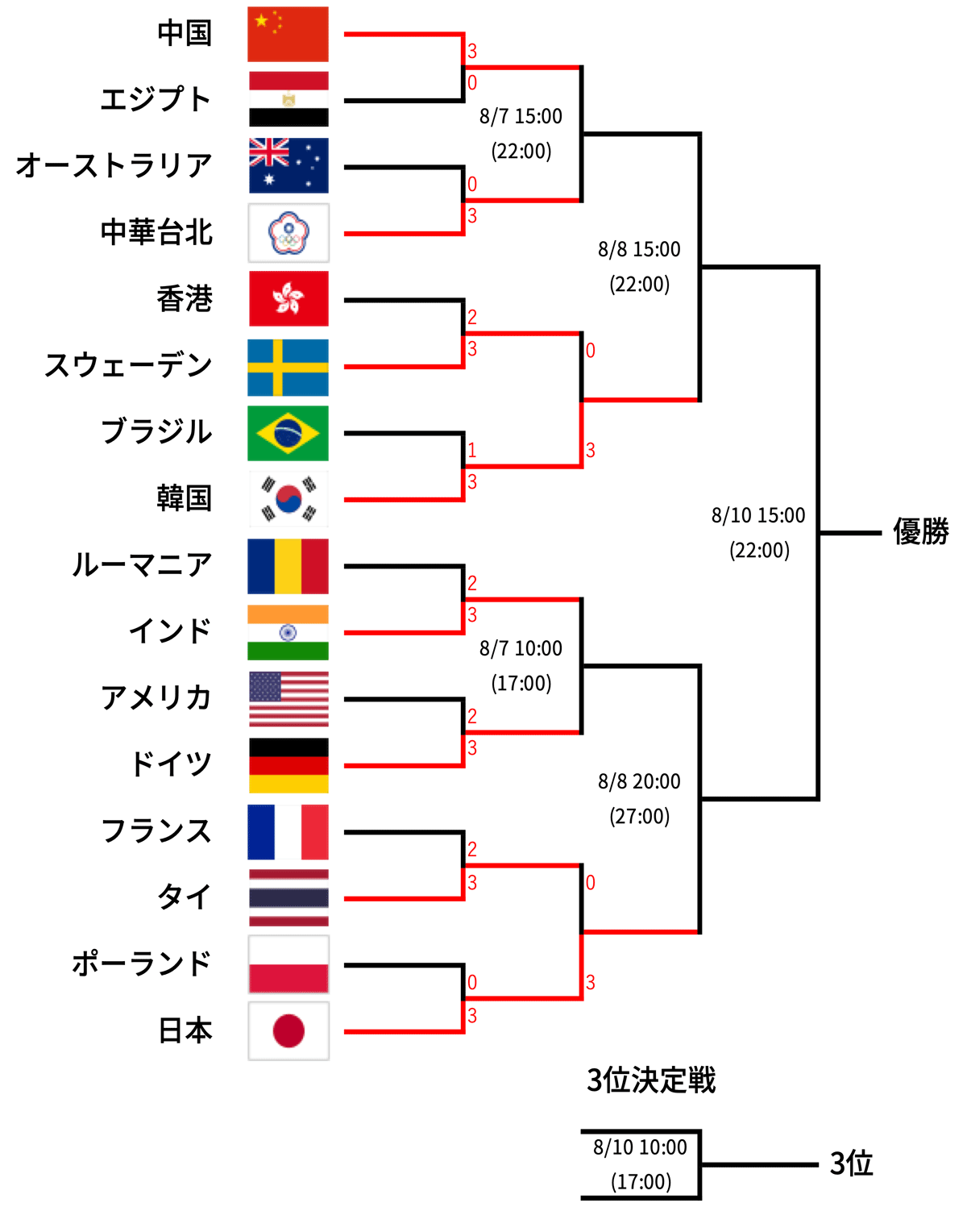 競技11日目の8月6日は男女団体の1回戦と準々決勝(2回戦)が行われた。